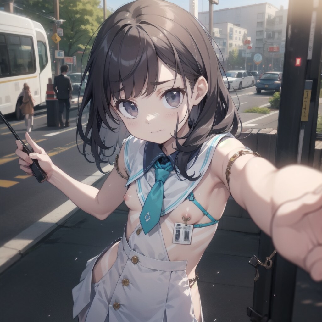 niptag <lora:nippletag-wasabiya:1>, (niptag is name tag with face photo that is fixed from the tip of the nipple peak using a safety-pin-pierce to make the beautiful tip of the bare nipple peak clearly visible:1.75), (niptag is name tag with face photo that is fixed from the tip of the nipple peak at bare chest to make the bare nipple peak clearly visible:1.75), greasy sweat, bare nipple, serafuku, chestless clothes, bus stop with many pedestrians without vehicle, cowboy shot, japanese junior high school uniform, open chest, 18yo, black hair, fine day,