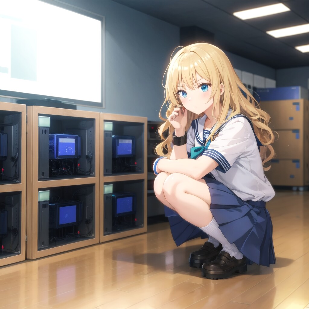 サーバールームでシステムトラブルに対応するちちぷいちゃん。生徒会として責任を感じ、腕章をつけたまま夜遅くまで修理に挑む姿。