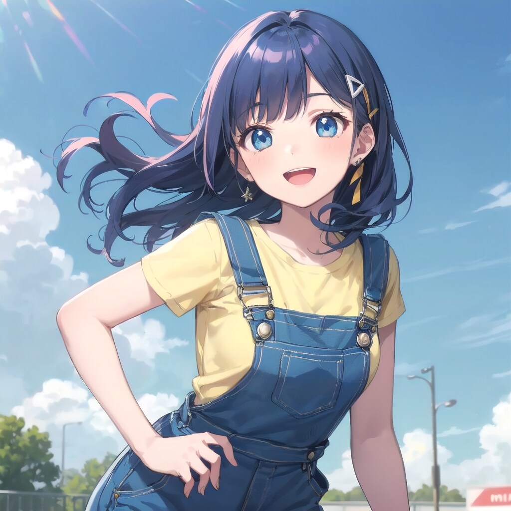 呪文 : (best quality, masterpiece:1.3, hires), (16 years old, 1girl:1.3, cowboy shot, cute), (deep blue hair:1.3, long hair:1.3, straight hair:1.3, white hairpin:1.4, blunt bangs), (open eyes:1.3, blue eyes:1.3, round-angled eyes:1.2, open mouth:1.4), (slender body type:1.1, medium breasts:1.1),