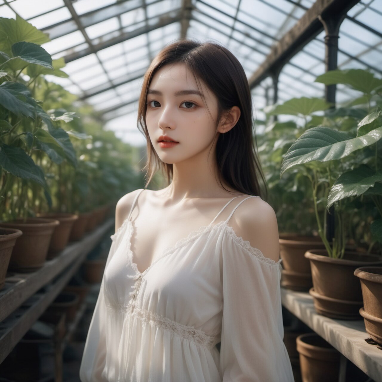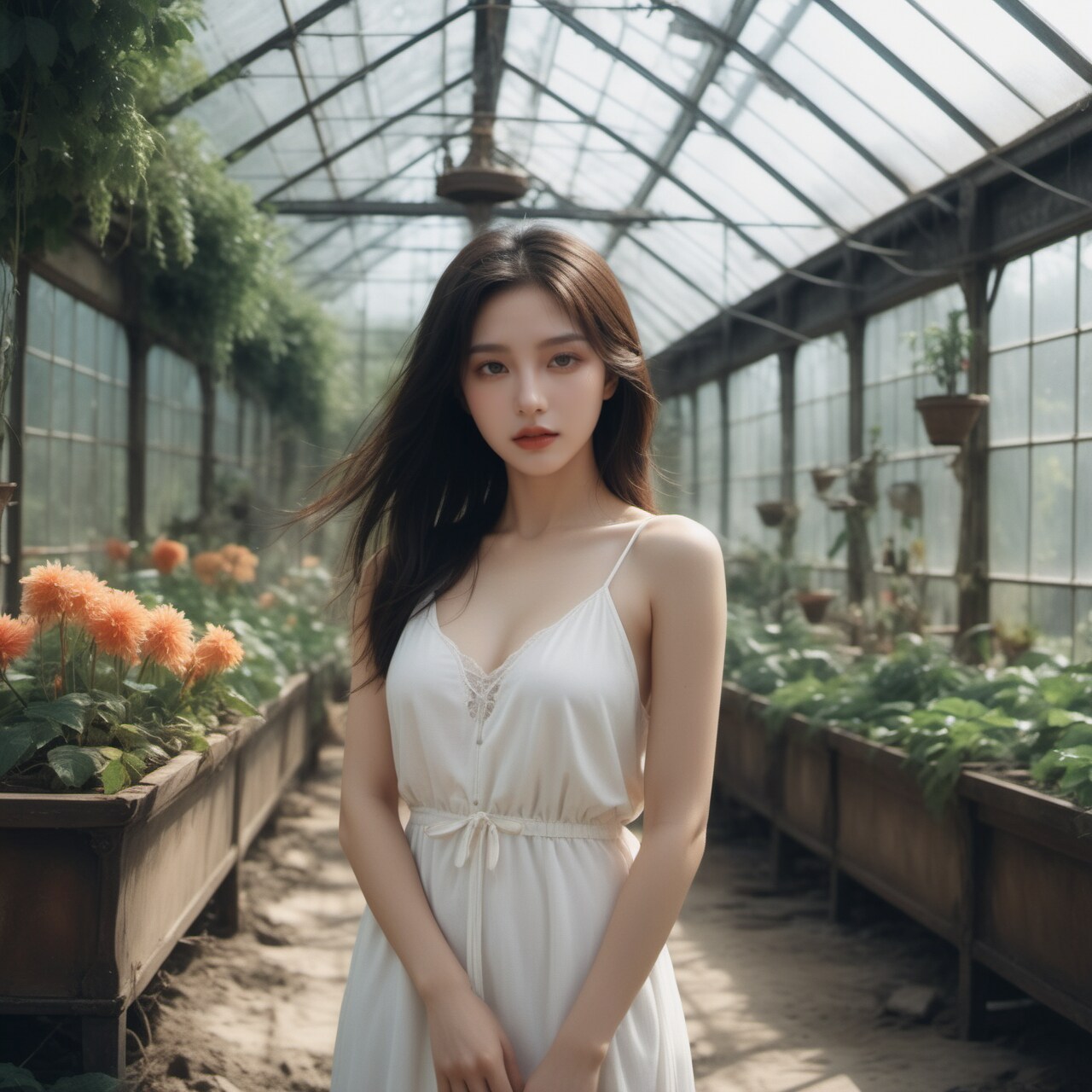 庭の持ち主が幸せそうに温室内の植物園を散策している様子をSDXLにて表現しました。