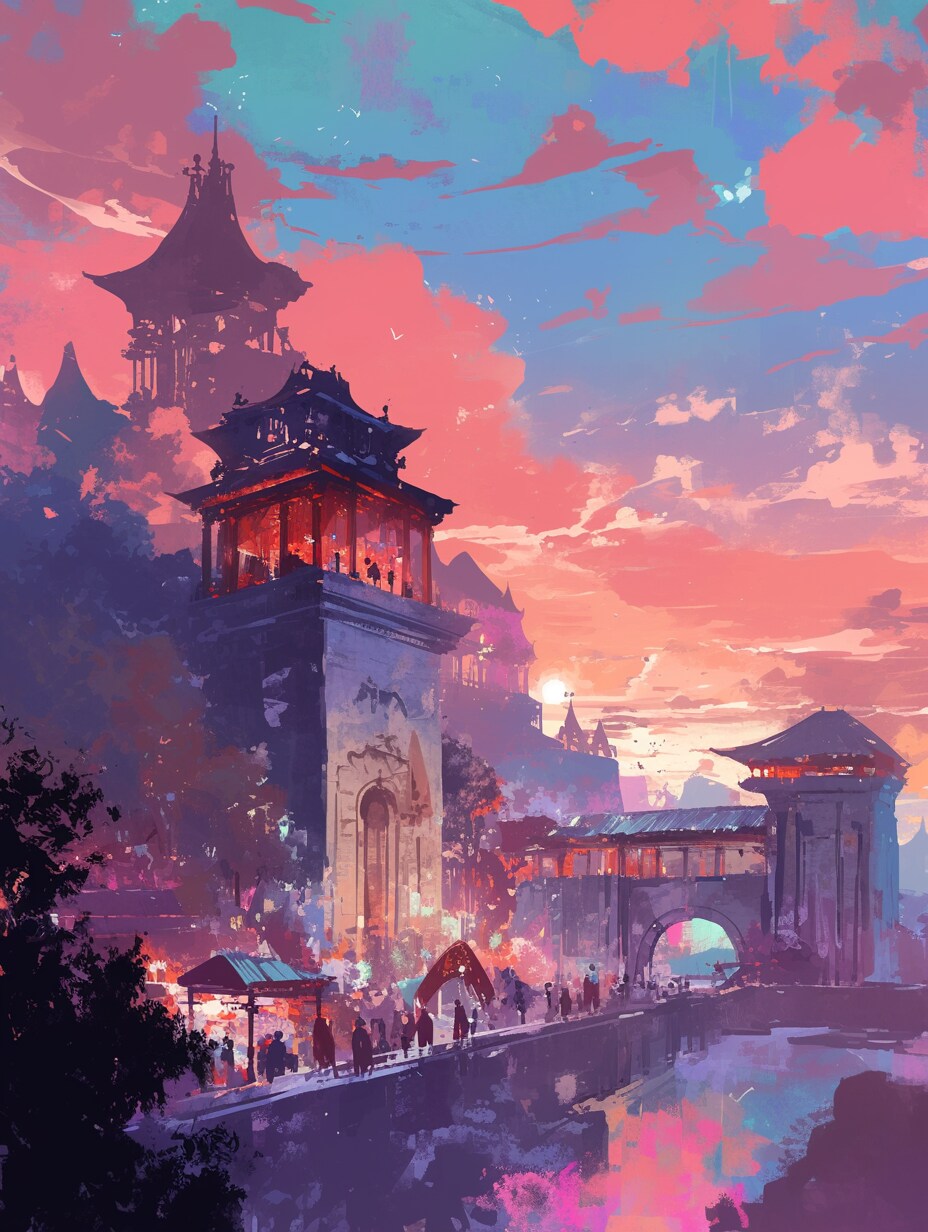 夕焼けに染まる異世界の街並み。幻想的な風景の中に人々の営みが感じられる。