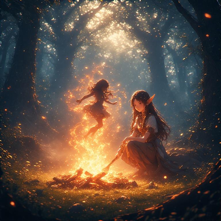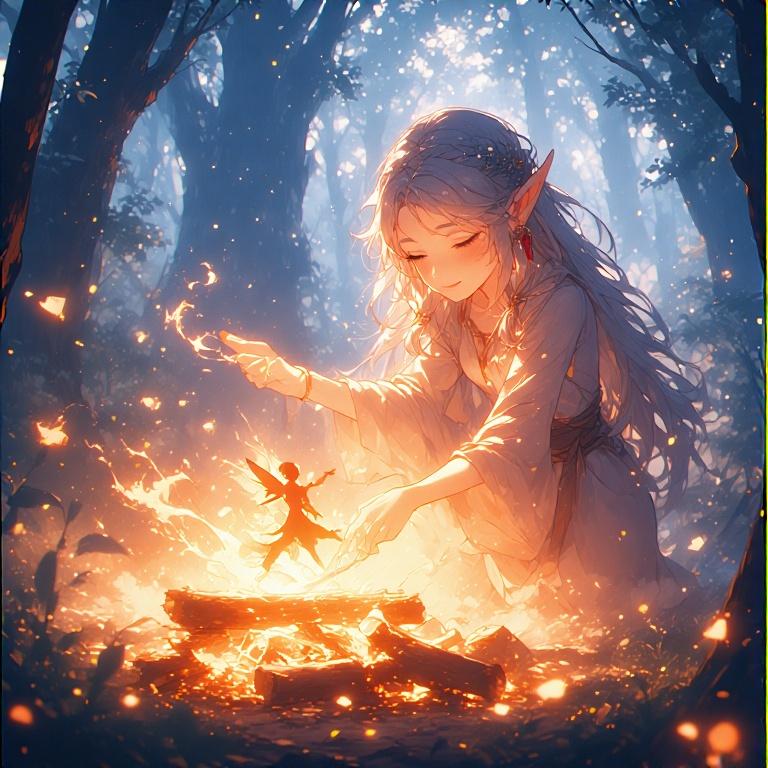 エルフの焚火で火の妖精がダンス