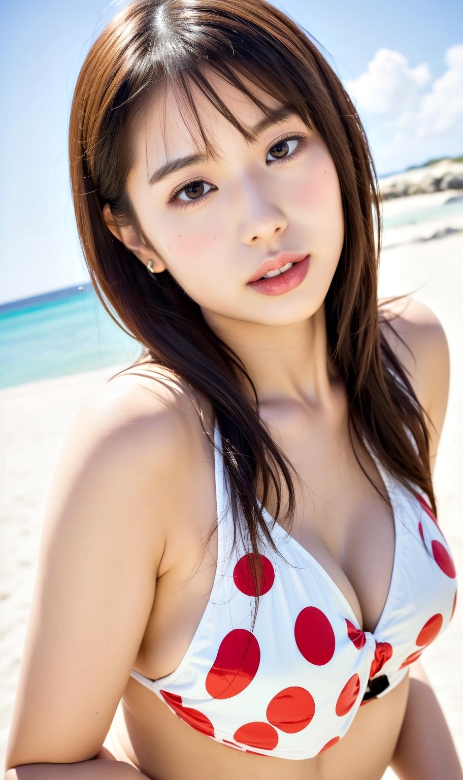 その写真をご覧いただければ、彼女の美しさが如何に魅力的で誘惑的か、お分かりいただけるでしょう。水玉模様のビキニが、彼女の肌にきらめく輝きを加え、その清純な魅力を引き立てています。彼女の微笑みは温かく、海の色に映え、まるで夢の中のような光景です。この写真は、誰もが心に残る、魅惑的な瞬間を切り取ったものです。