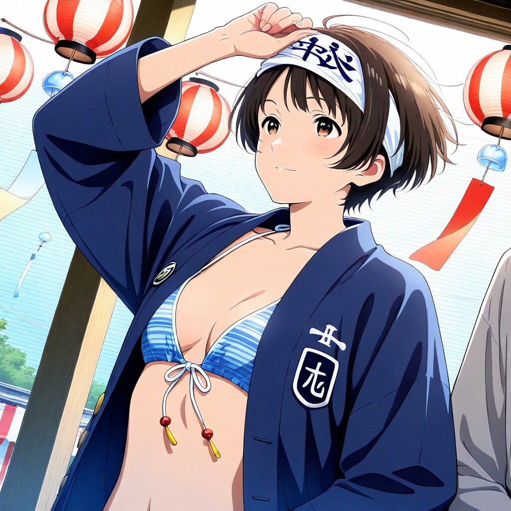 あるお祭りで、御神輿を担ぐために、ボーイッシュ系の女の子が、暑気払いの水をぶっかけられてもいいように、法被にビキニ姿というマニアックな恰好で参戦するようです