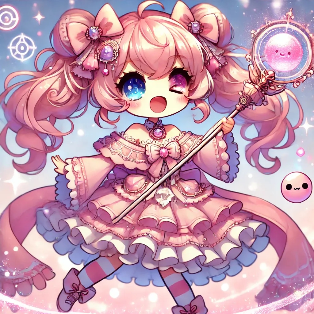 (背景:キラキラの変身バンク風、ピンクの衣装と杖)
