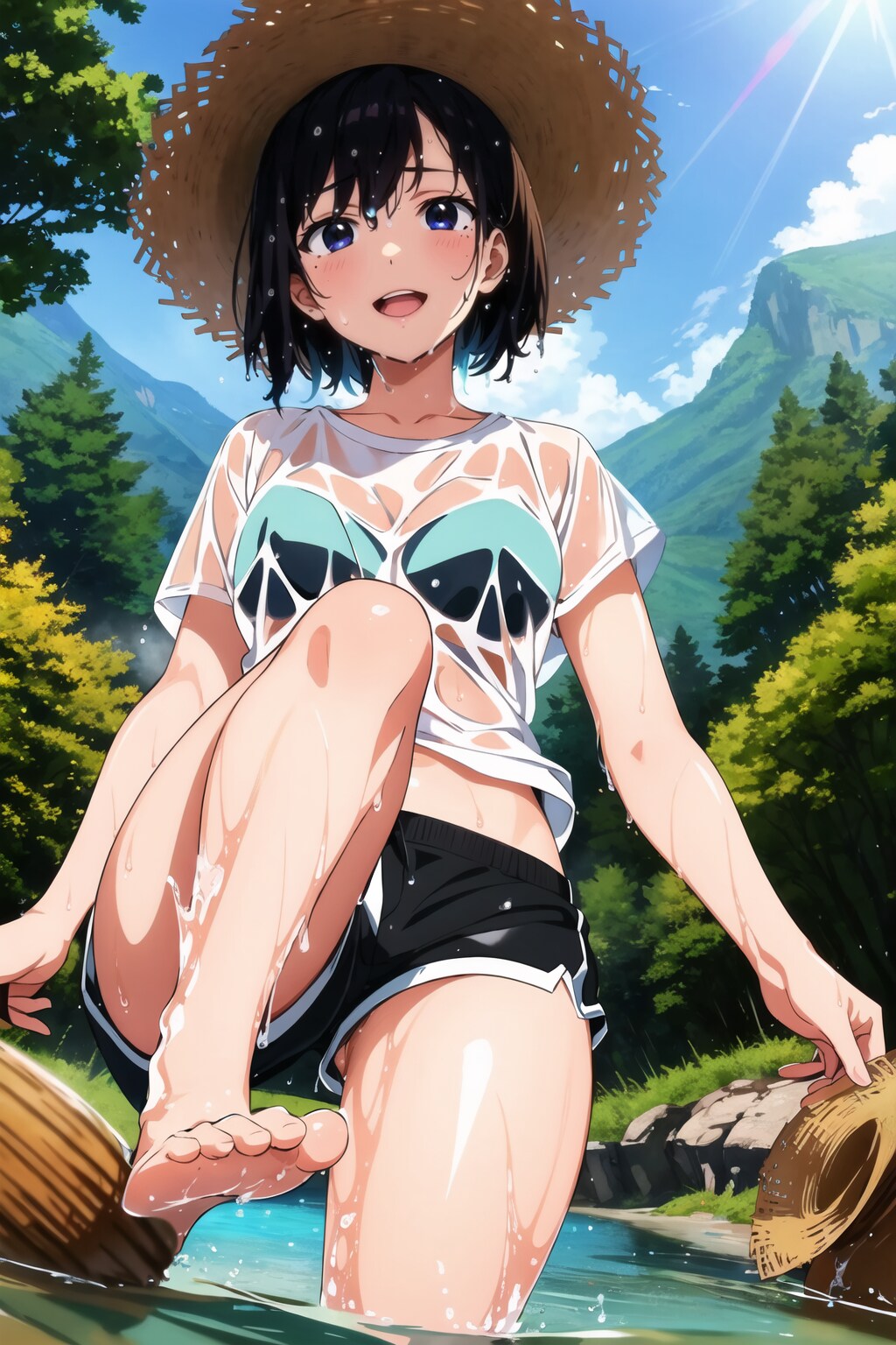 jacket partially removed, heart in eye, burnt clothes, holding fishing rod, kanji, doujin cover, pentagram, tape gag, adjusting headwear, red socks, friends, cloud print, coke-bottle glasses, oral invitation, competition school swimsuit, barbell piercing, gradient legwear, prisoner, blood on breasts, wind chime, carrying over shoulder, tape measure, flaming weapon