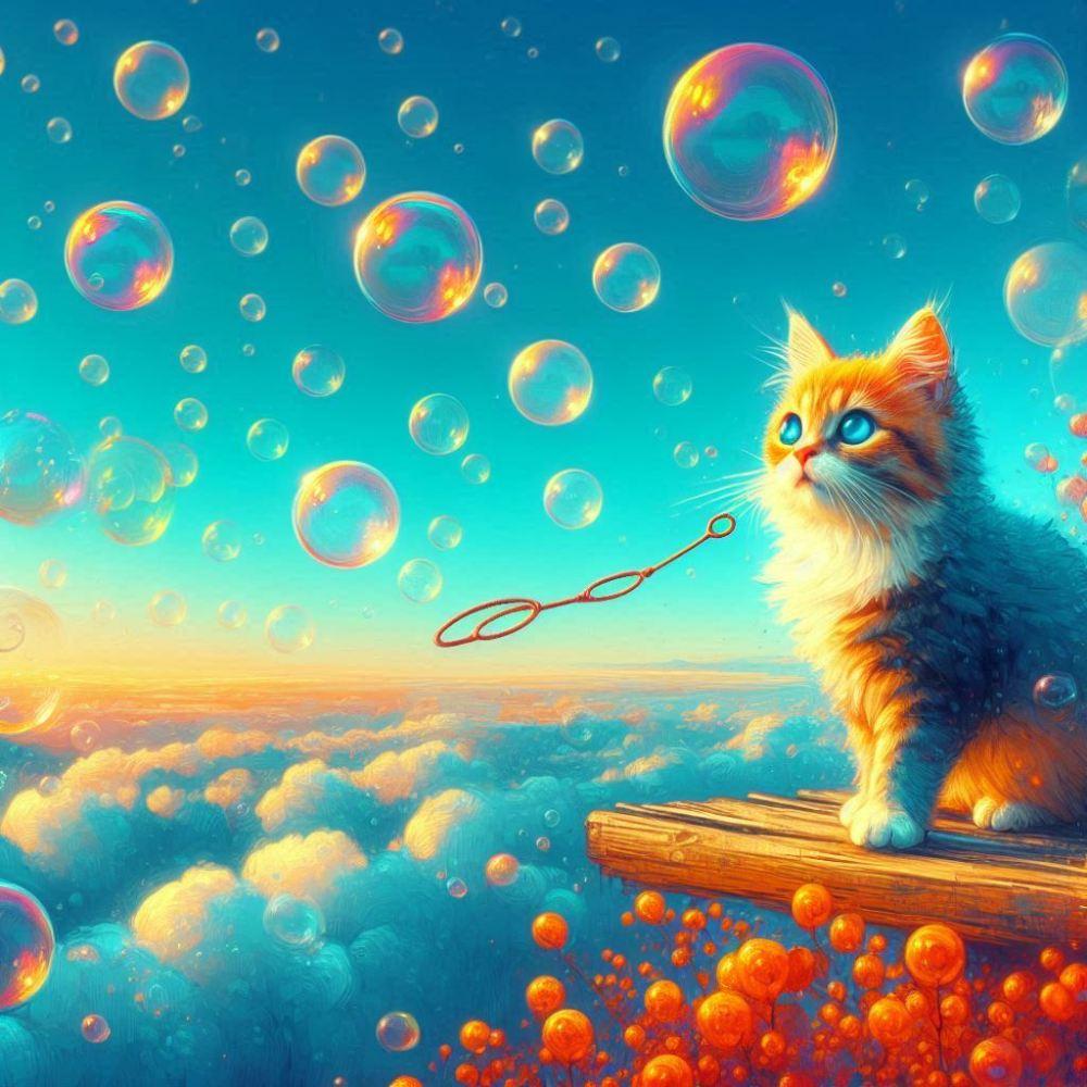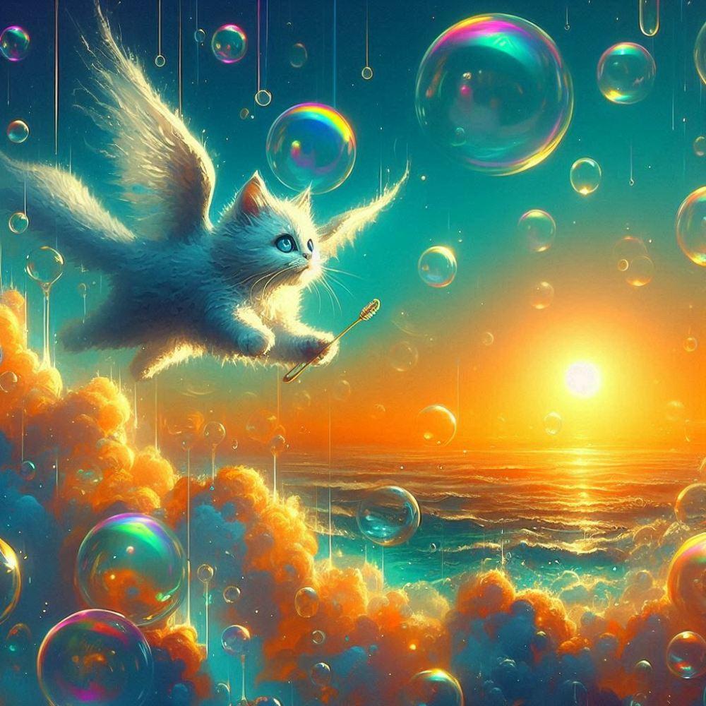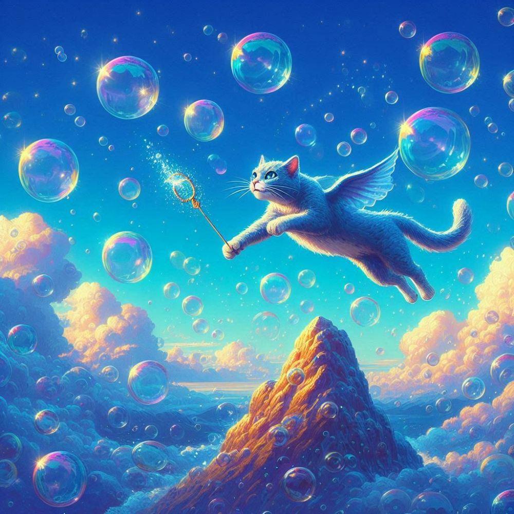 ファンタジー風 シャボン玉の青空を飛ぶ猫