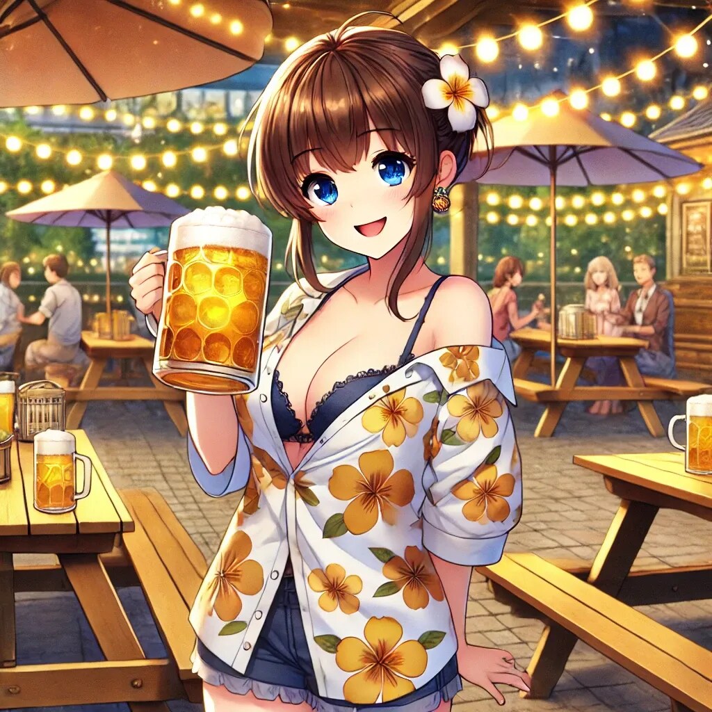 ビアガーデンジョッキビールを持っている、アロハシャツを着た女の子です。