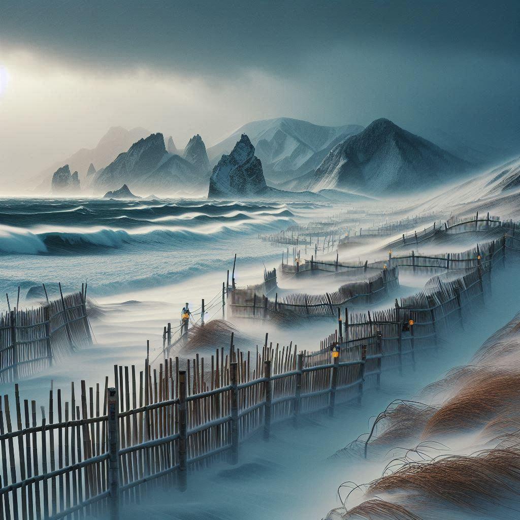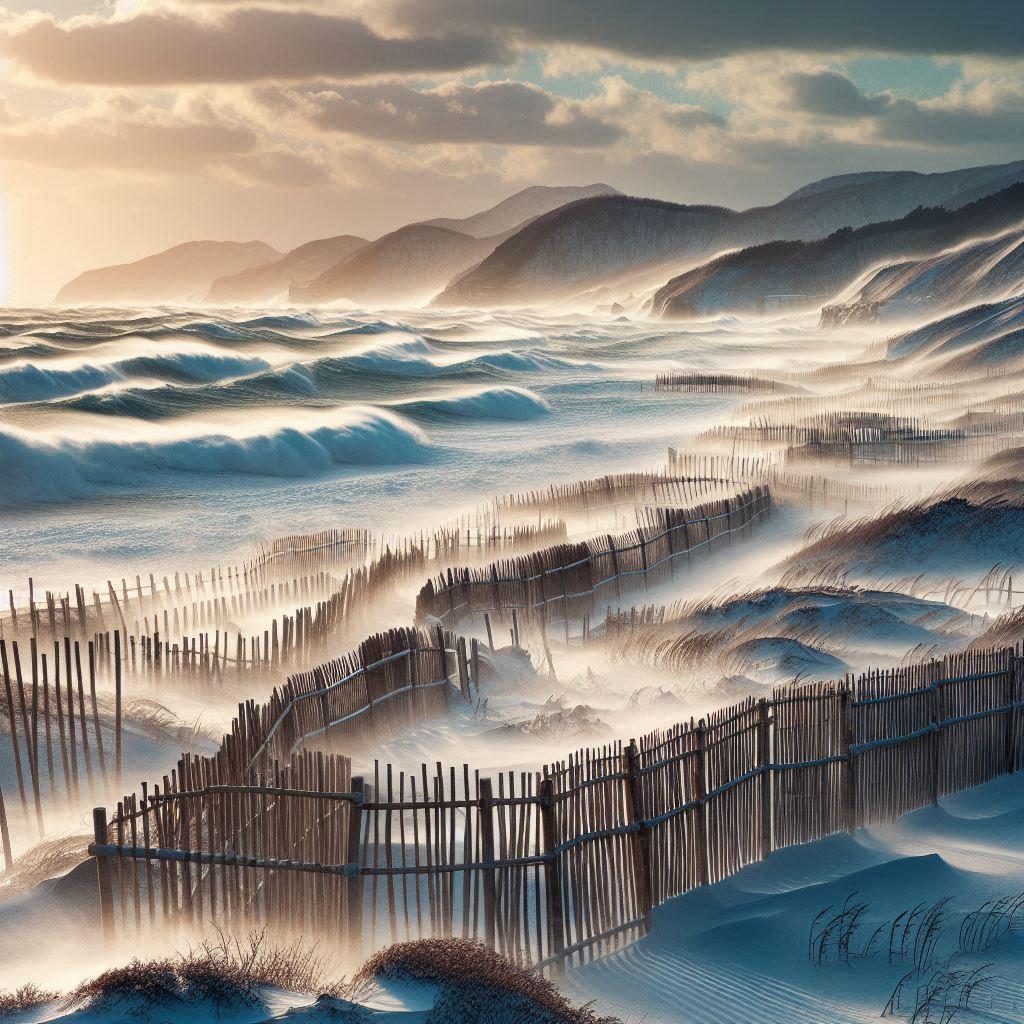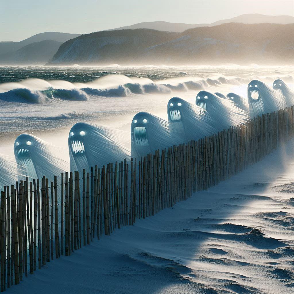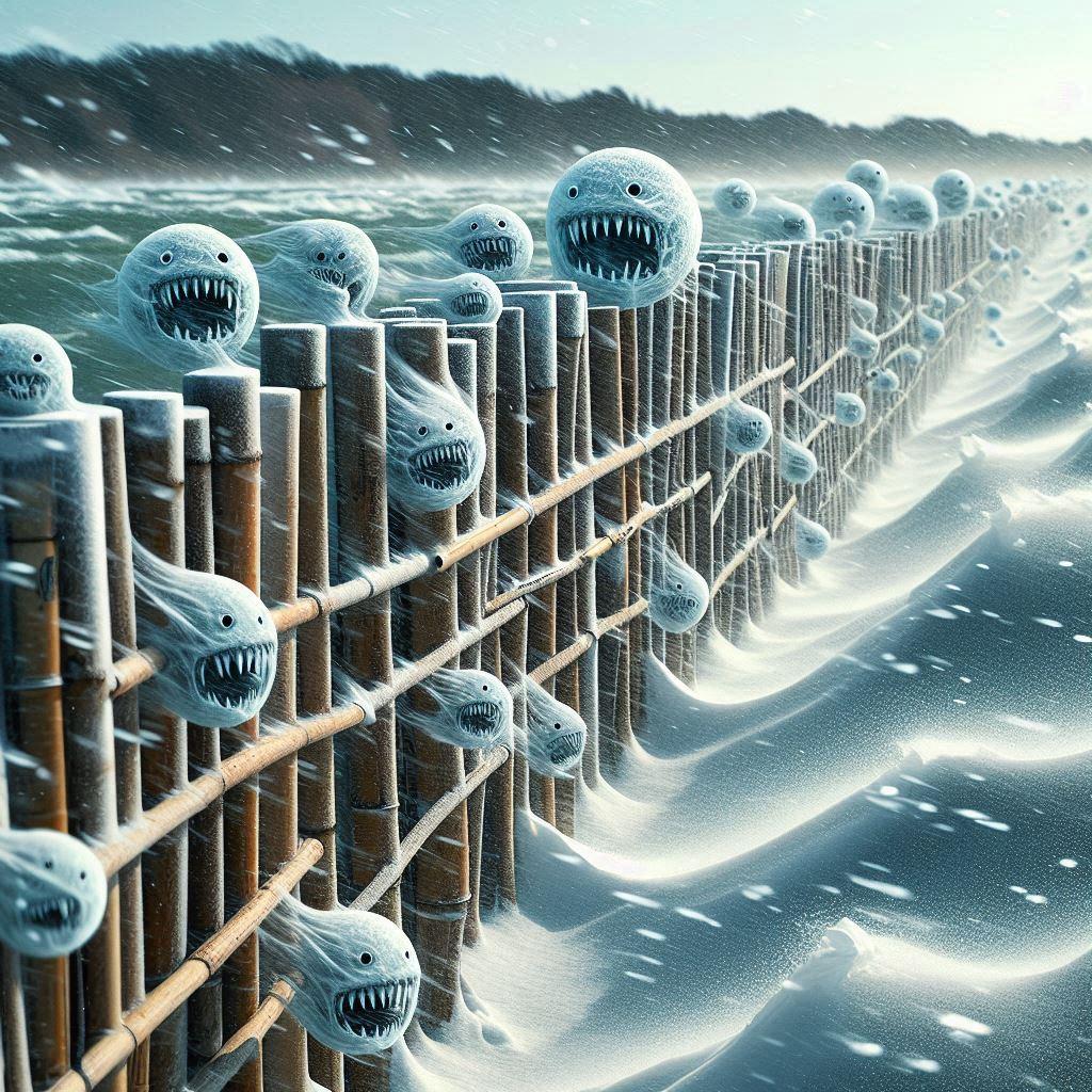 冬、この絵のような風よけの竹垣などに強い風が当たると、笛のような音がすることがあります。これを「もがりぶえ」と言うそうです。