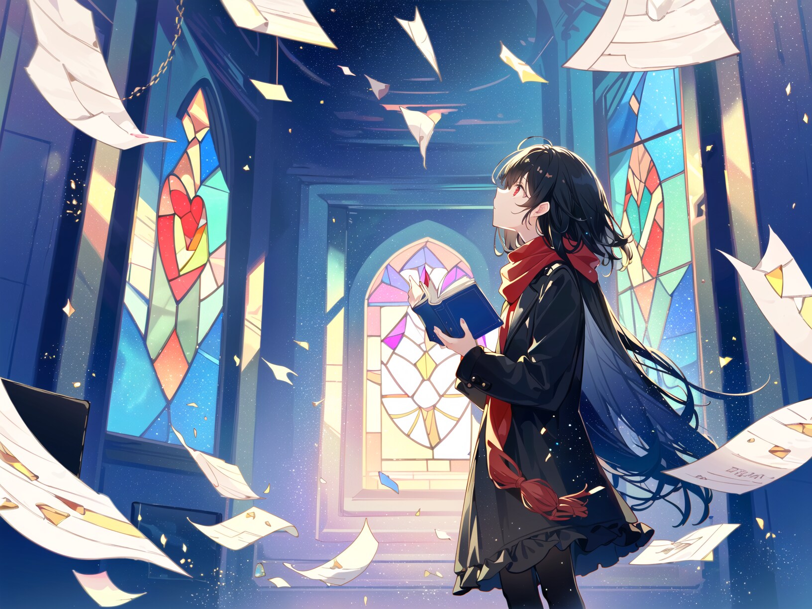 (in library:1.2), (messy room:1.2),(gothic room:1.2),(dark atmosphere),(canopy),clutter,(lots of books:1.5),(Miscellaneous goods are placed in a mess:1.2),(colorful sphere),(Stained glass:1.6),