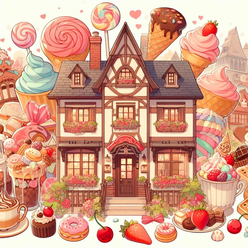 結果こちらでも、お菓子の家というより、お菓子屋さんみたいになりました~。プロンプトにチョコやクッキーと入れれば、よりそれっぽくなったかもしれません。