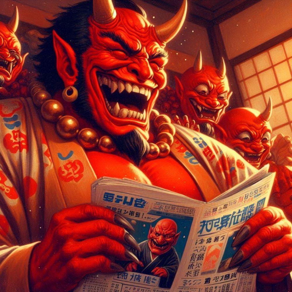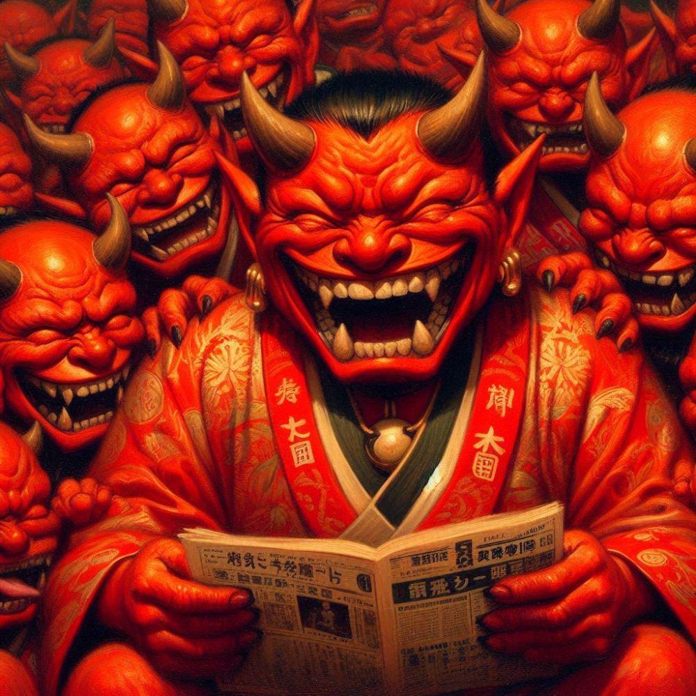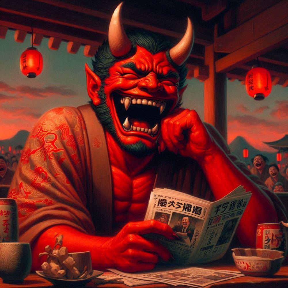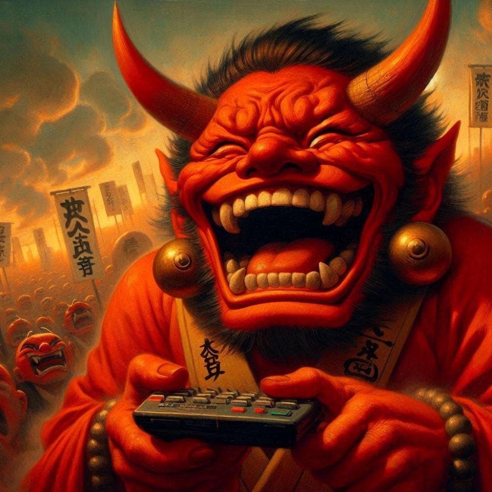 油絵ファンタジー、ニュースを見た日本の鬼が笑う節分の日