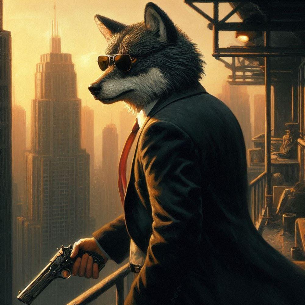 油絵アクション、振り向く殺し屋狼&タヌキ