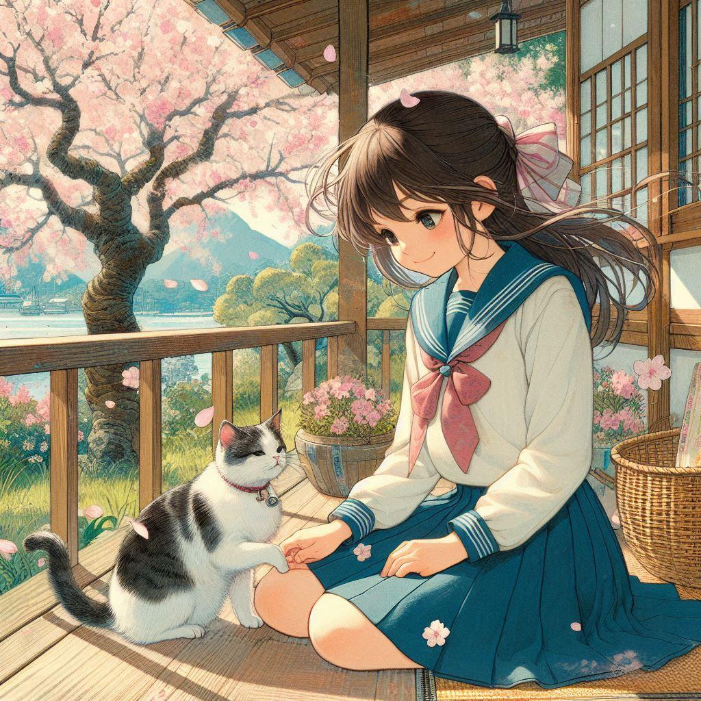 庭の縁側で、少女は猫と一緒にひなたぼっこをしていた。