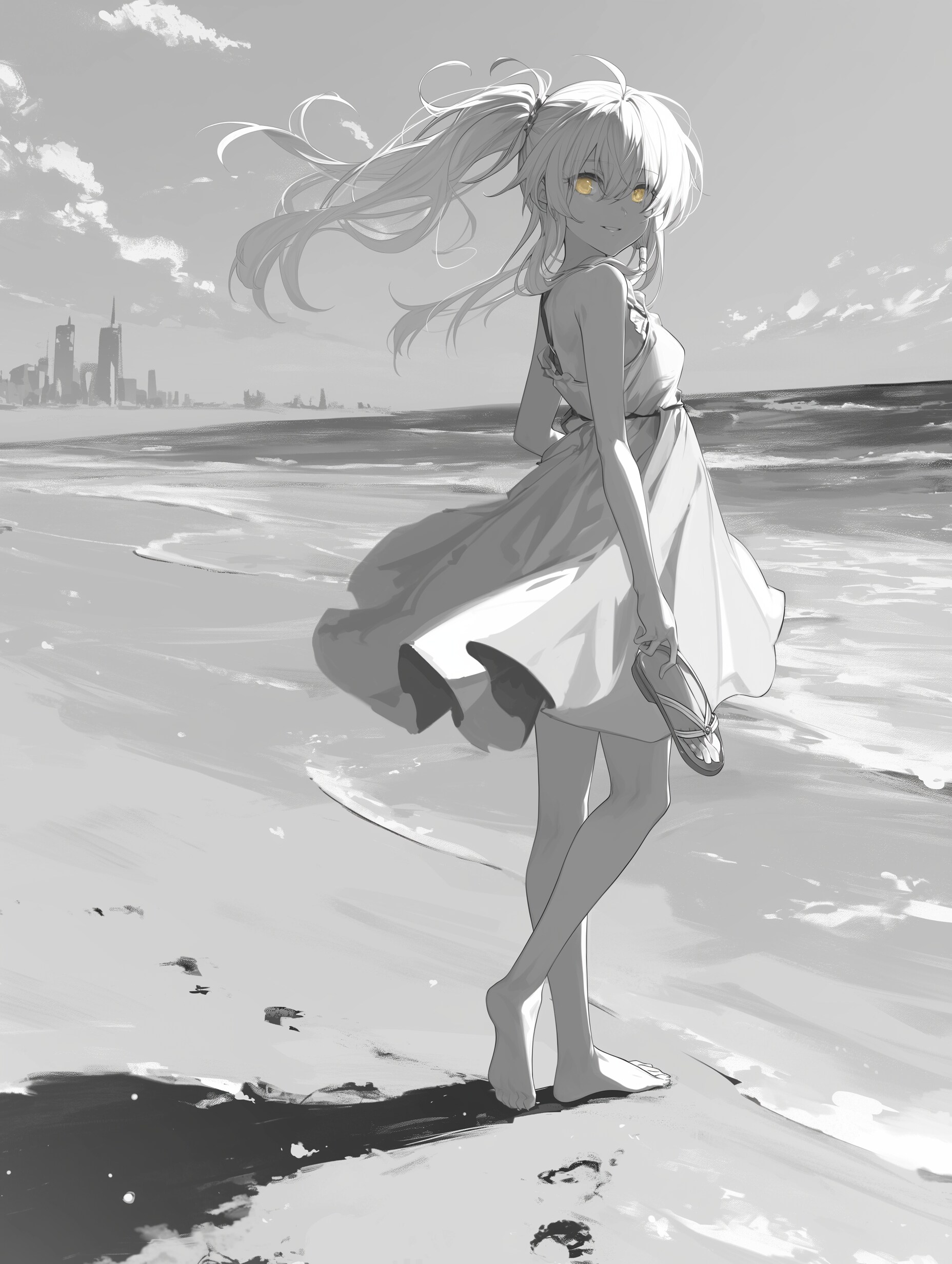 サンダル手に持たせて、砂浜に足跡をつけてみました。