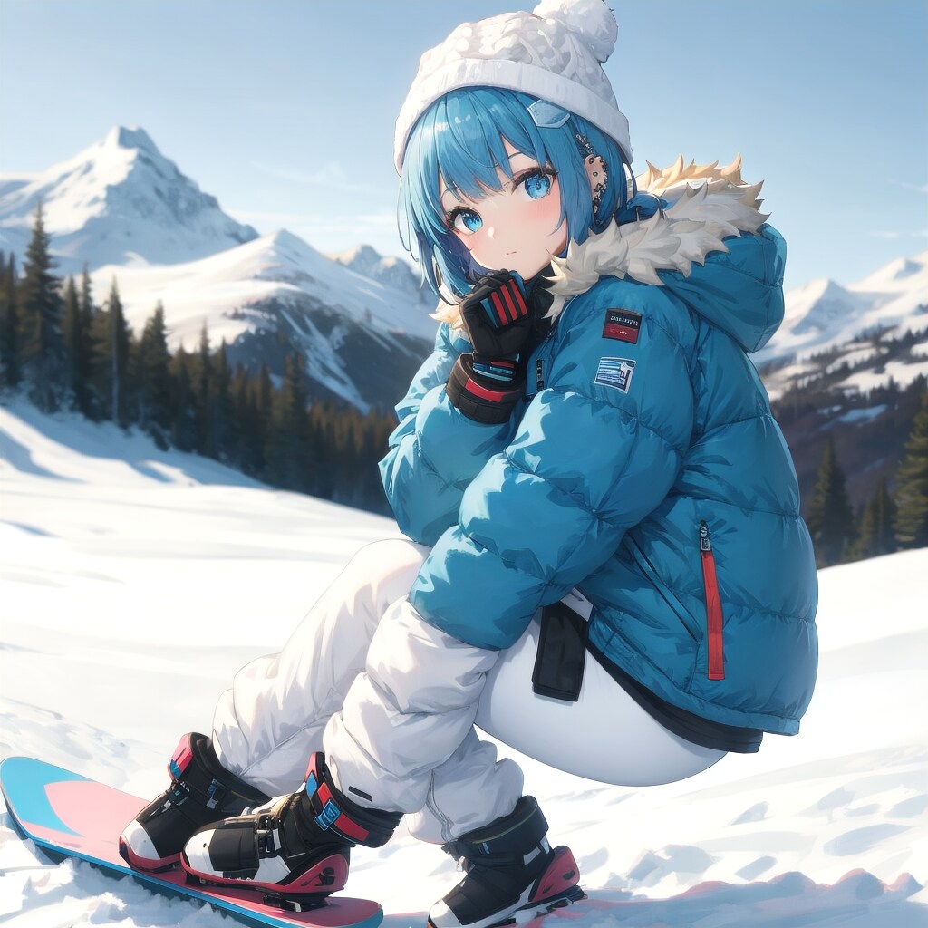 スポーティな冬の衣装でスノーボードを持ち、白いマスクをつけた爽やかなスタイル。