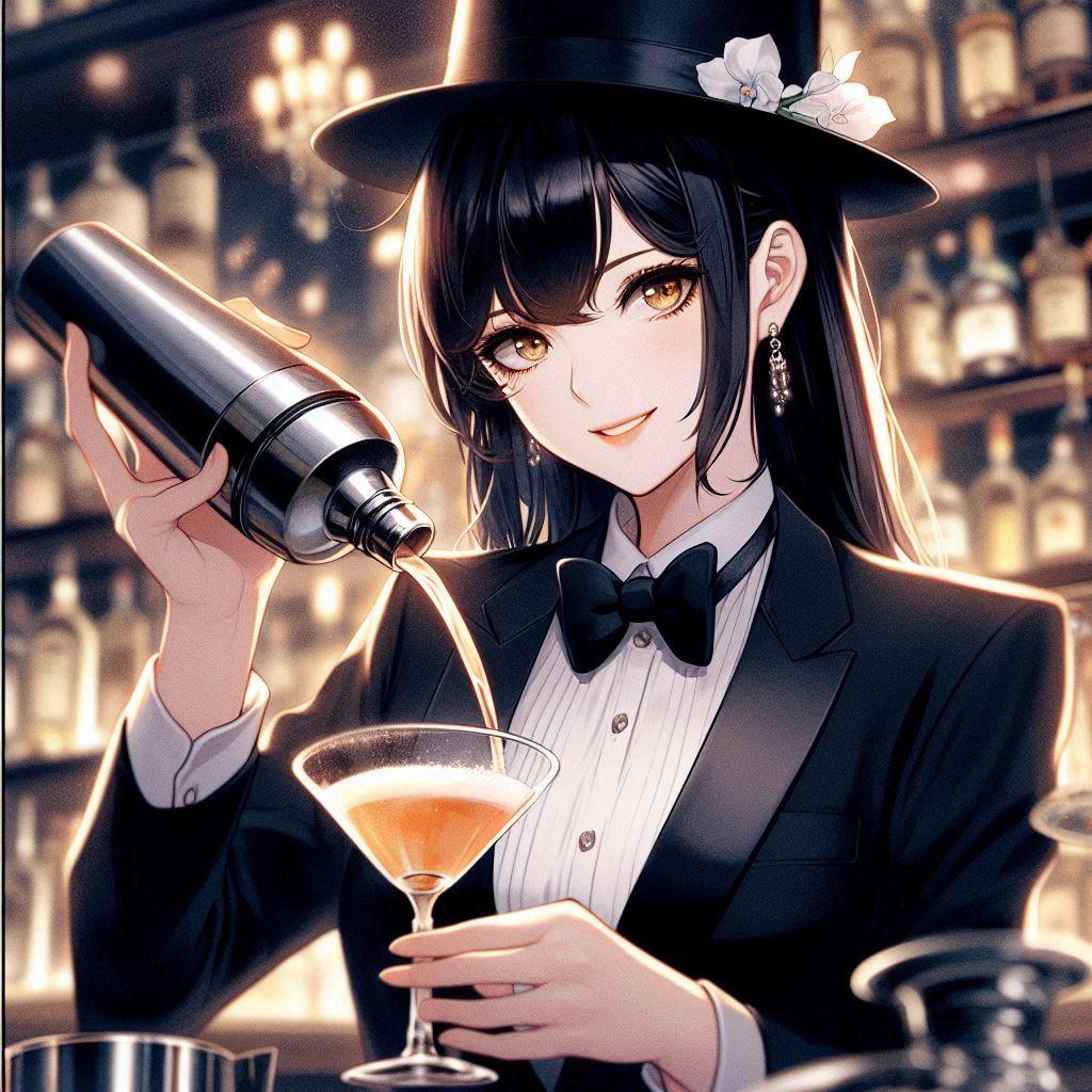 シェイカーを持っているミアさん。Dall-3ではシェークしている最中は個人的には難しく、お酒をグラスに注いだり、シェイカーを持つことで代用しています。