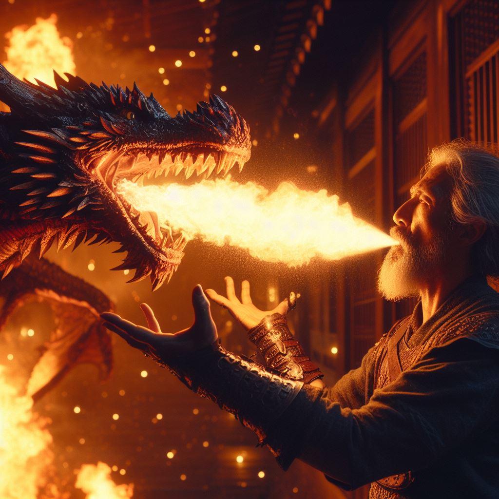 焰龍は「グォーォム」と低く鳴き、口から炎を放った。その炎は強力で、空を真紅に染め上げた。一方、真火も深呼吸をして、「神々の加護を…」と呟きながら、強大な神炎を焰龍の方へと放った。二つの炎が「バルム!」という轟音と共に激しくぶつかり合い、その熱と光で夜のヒノイの村は明るく照らされた。