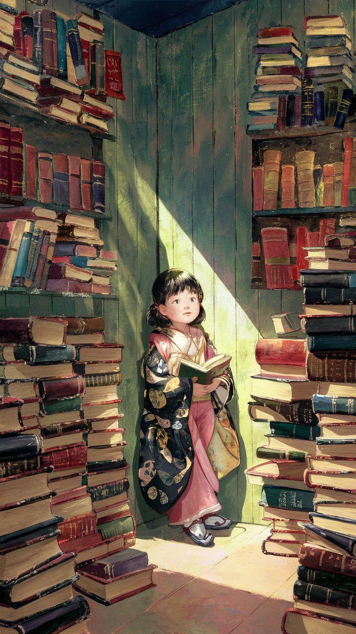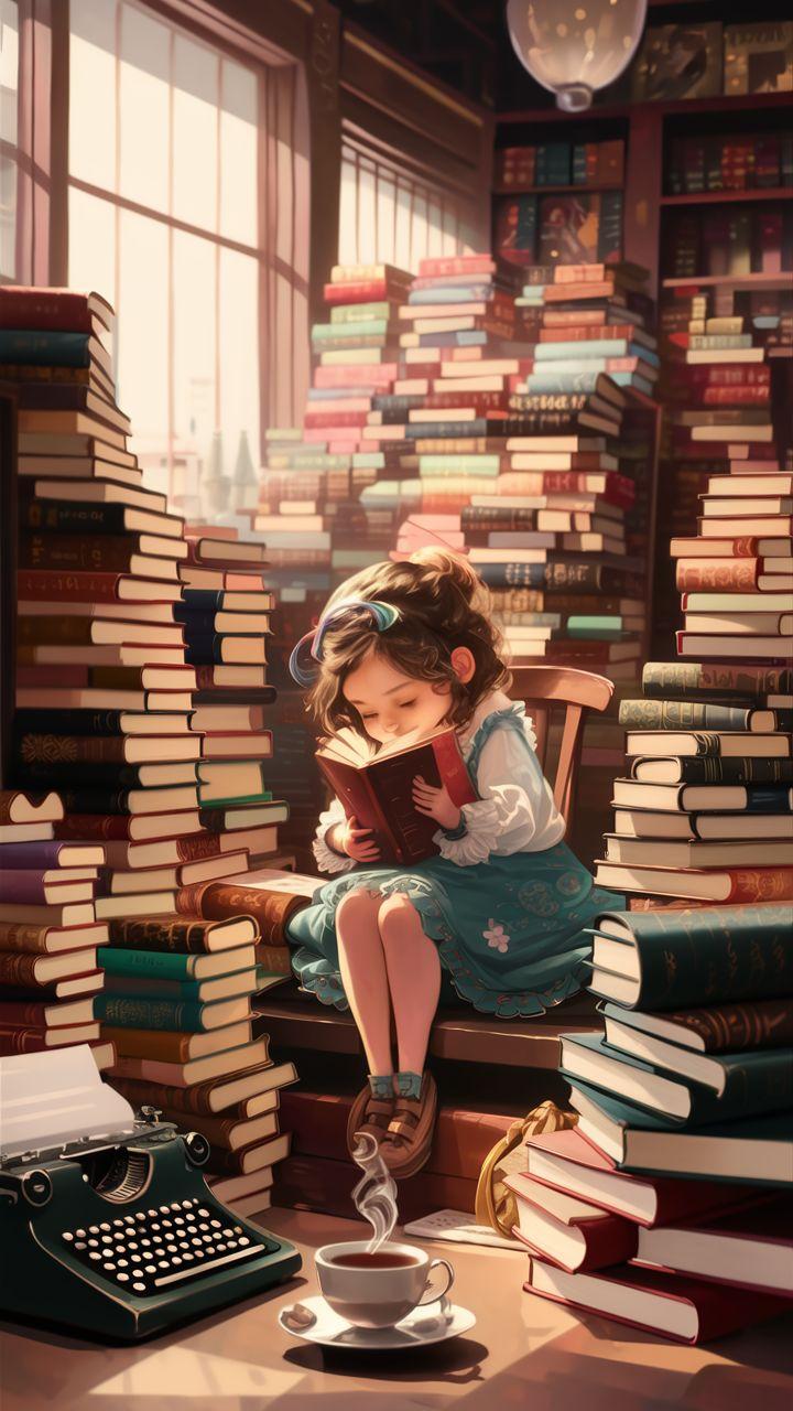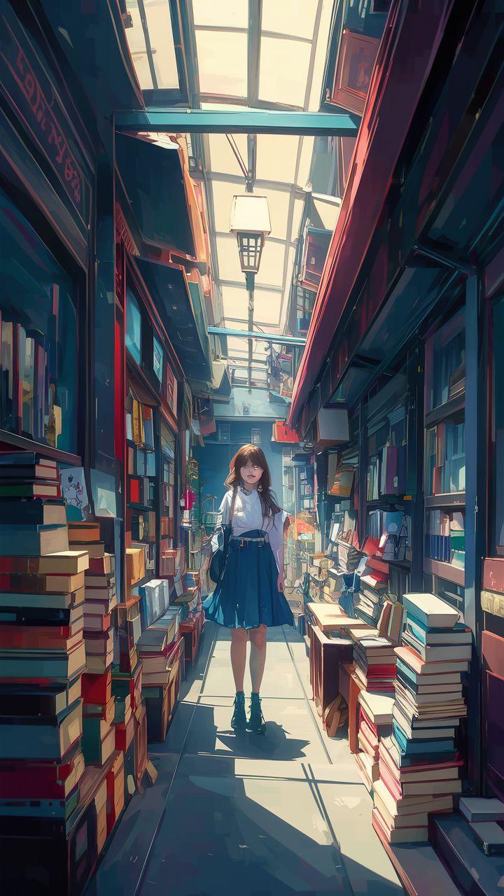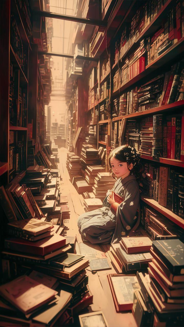 オリジナルプロンプトは「Japanese retro painting, used bookstore, stacked books, 1 girl」