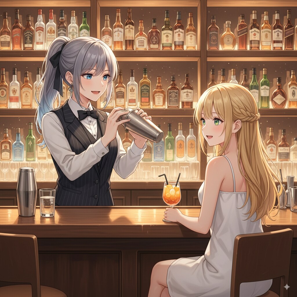 記念イラストはnano bananaで香澄さんと凪咲さん、遥さんと澪オーナーがバーで会話しているところを生成しました。