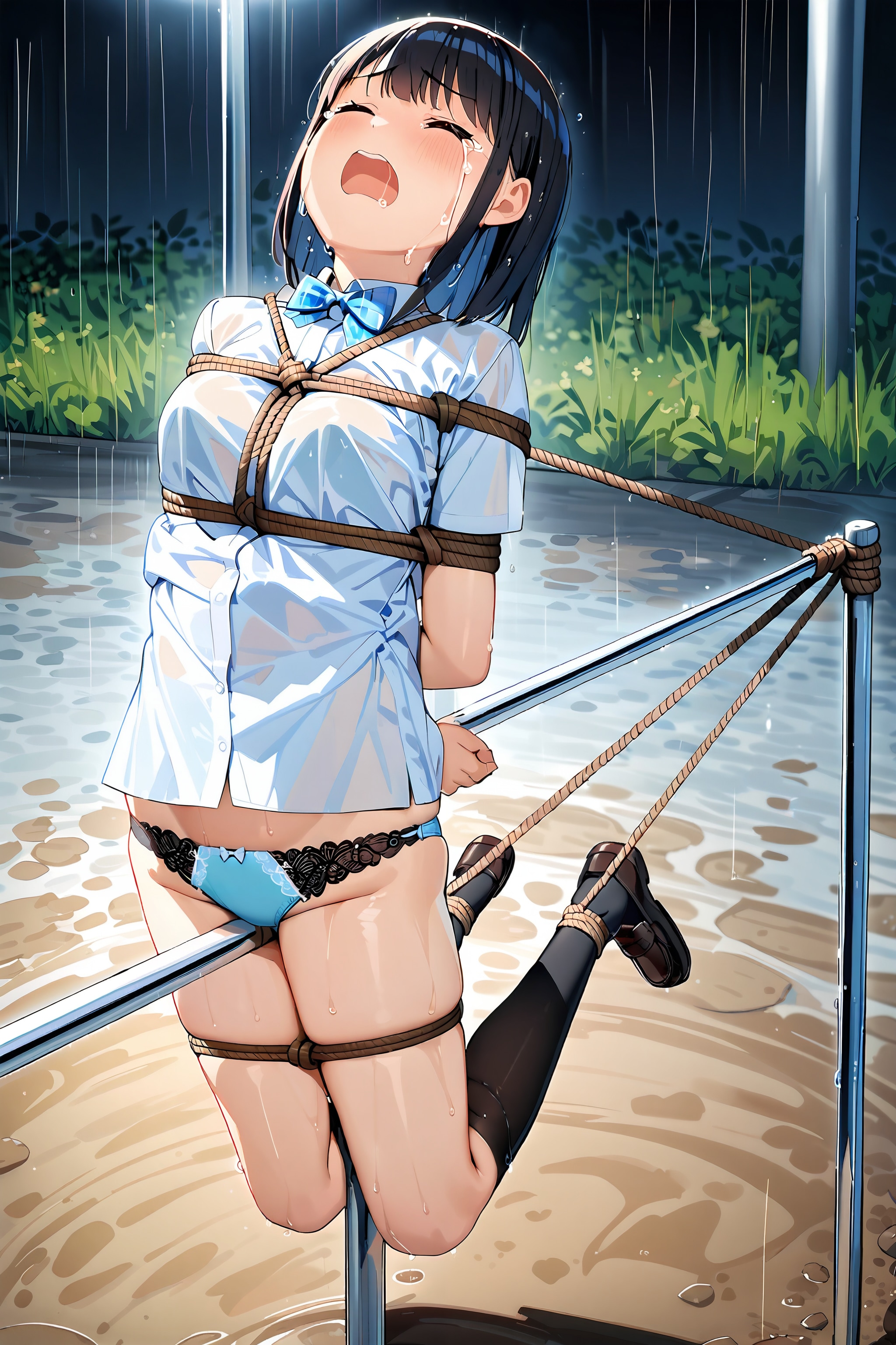 雨の中、公園の鉄棒にまたがらされて拘束放置されるJK