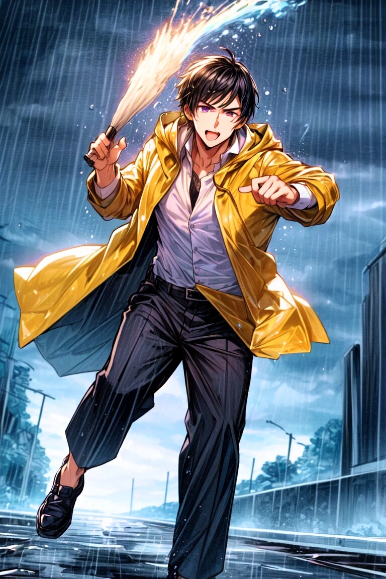 彼は灰色のシャツと黒いズボンを着ていて、半透明のレインコートを身にまとっていました。雨は激しく降っており、彼の服はびしょ濡れです。彼は透明な傘を持っていましたが、それでも雨は彼の体に当たっていました。