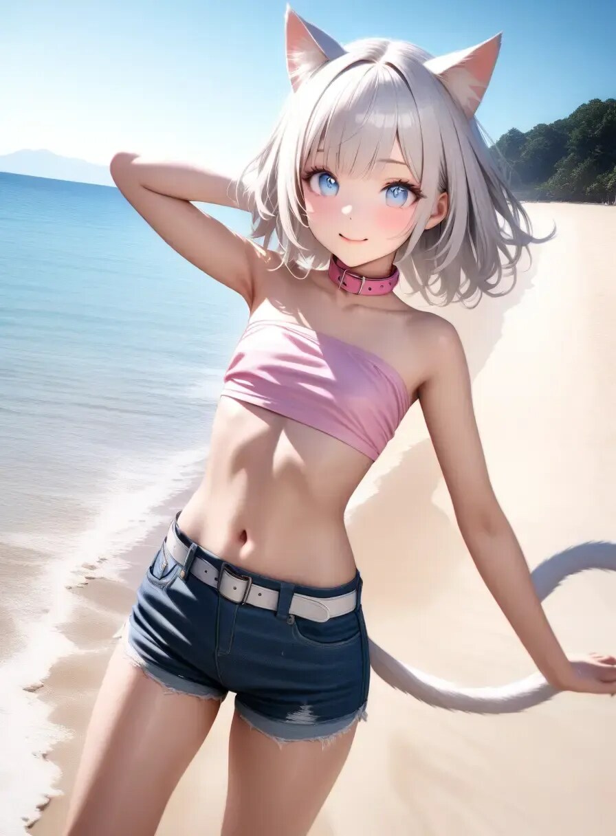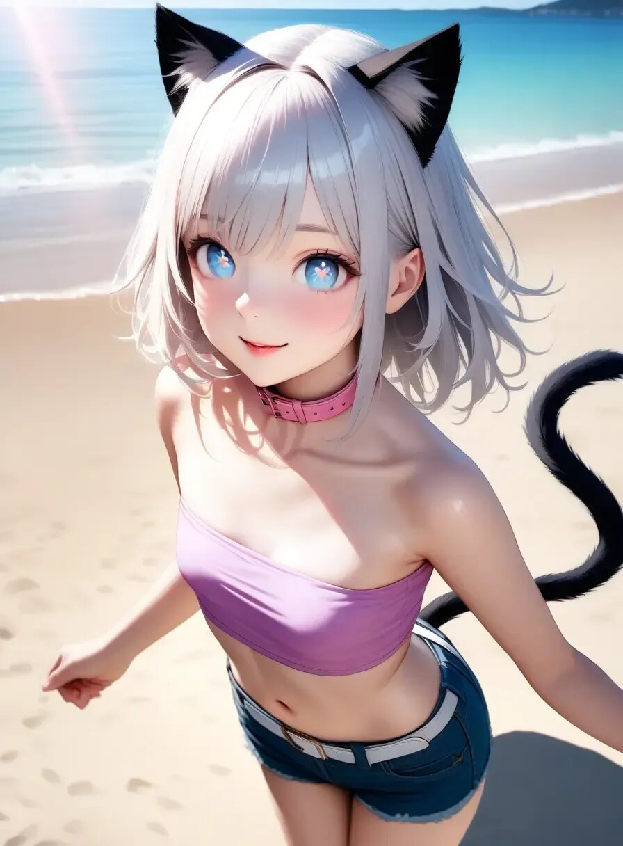 White cat ears,tail,blue eyes,slim body,small chest,stylish medium hair,white hair,18 yo,pastel pink collar,tube top,low-rise denim shorts