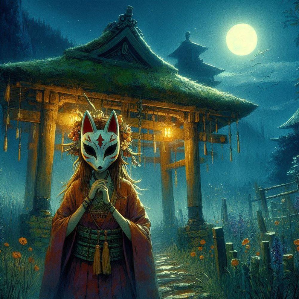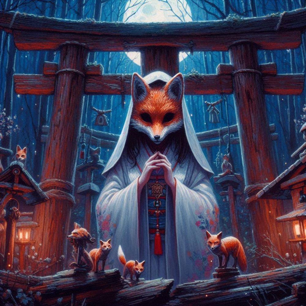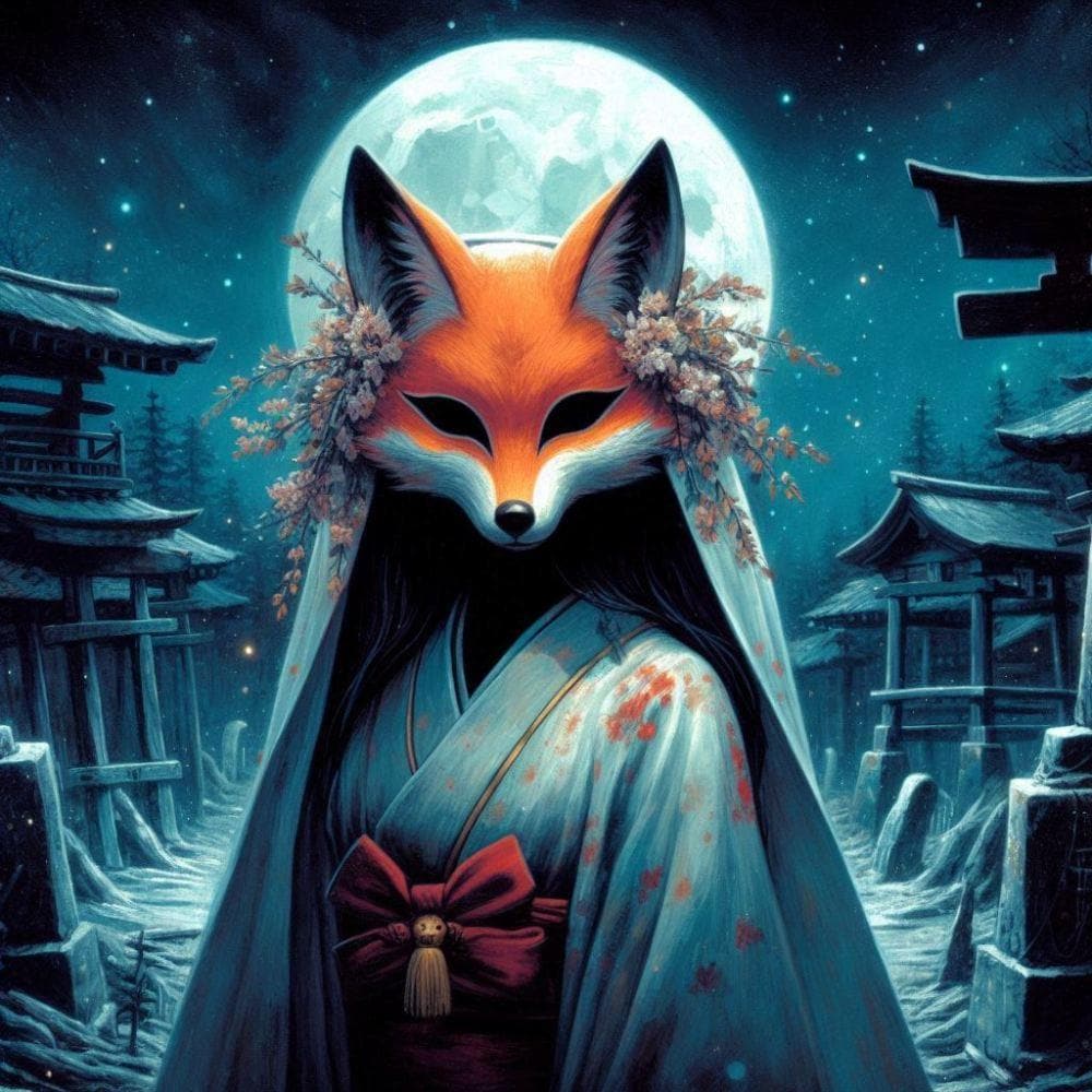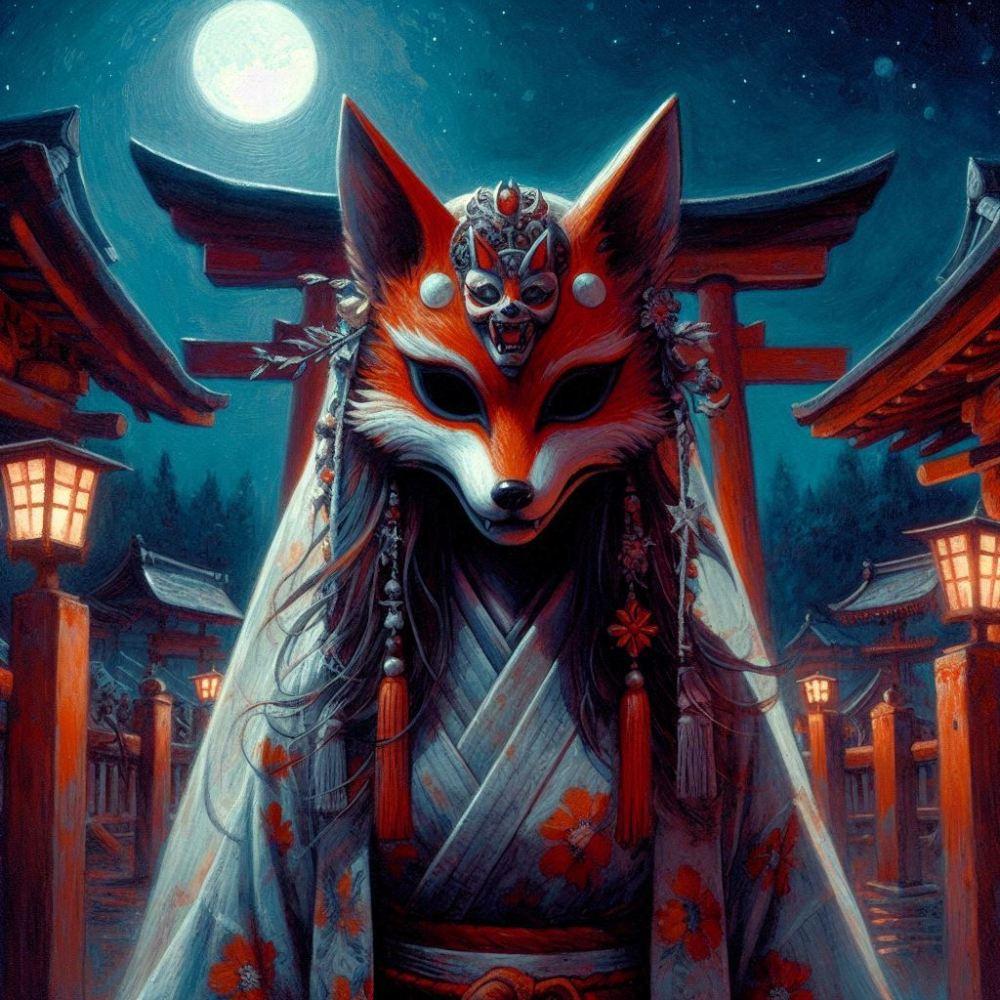 ホラー&アクリル風 狐面で顔を隠した狐の巫女
