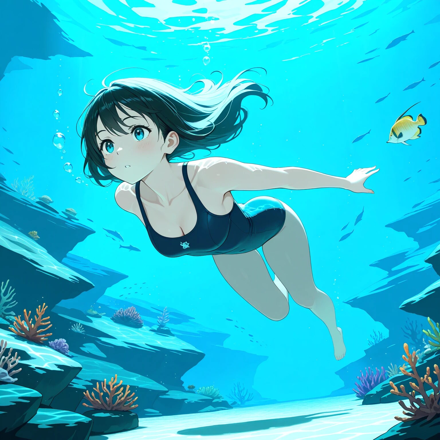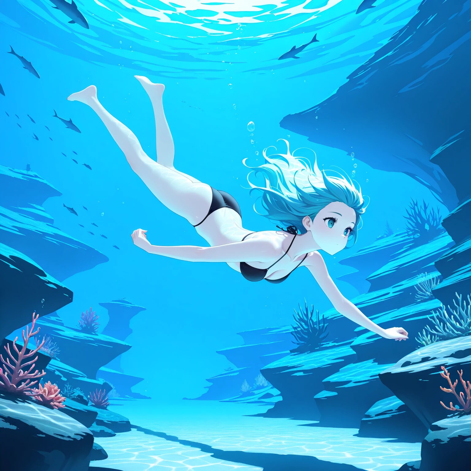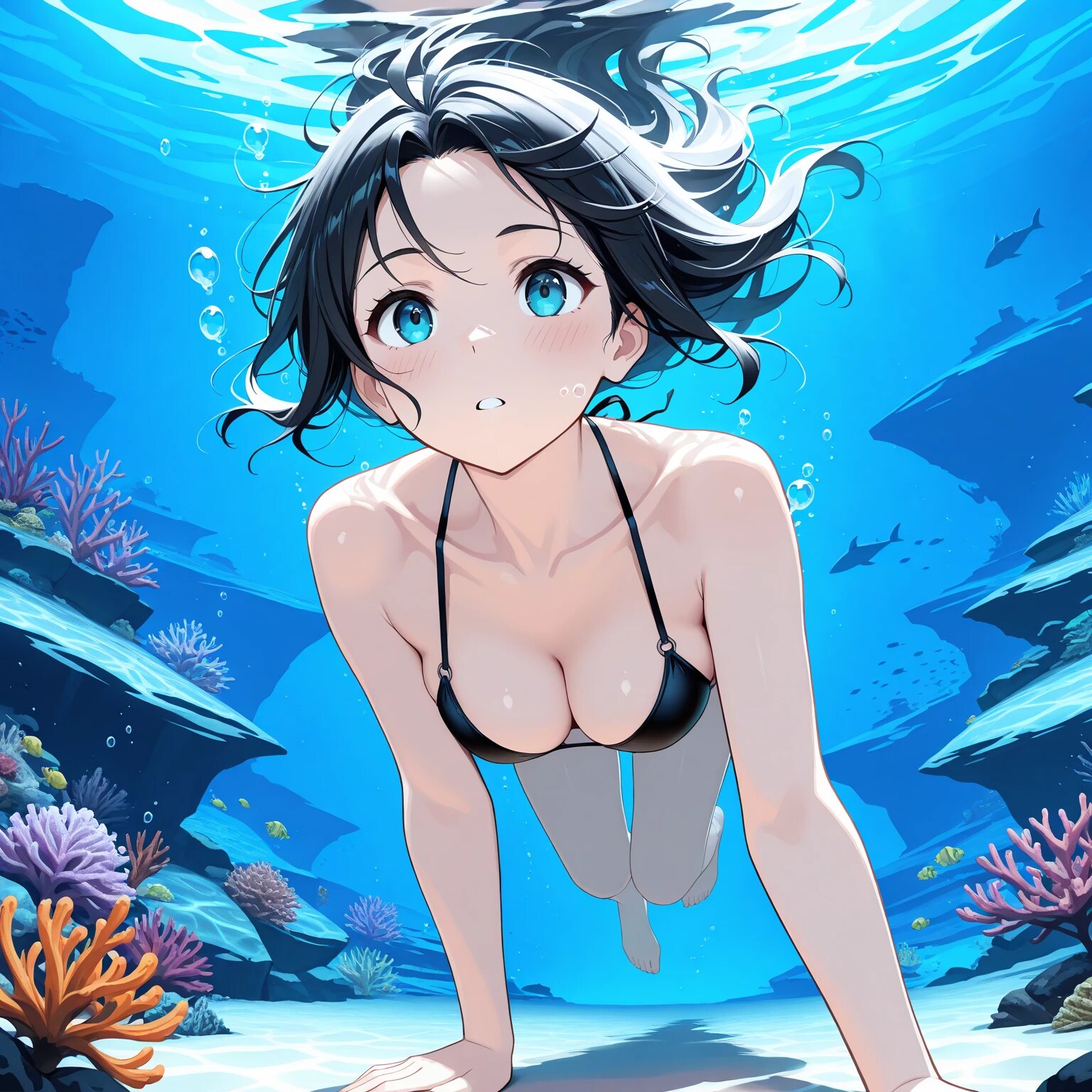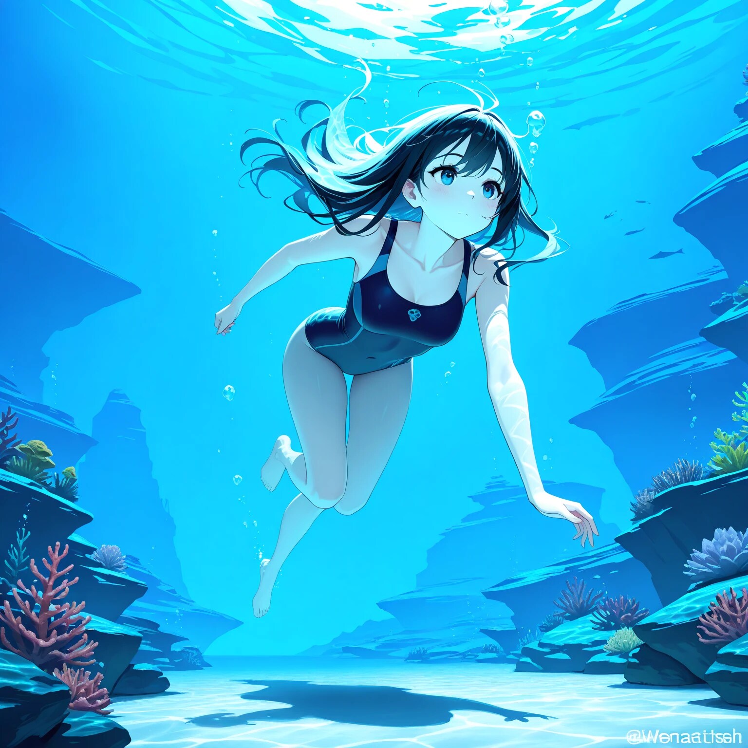 品質タグに1girl, underwater, swimming,で作ったのが1~4枚目。ちょっと青っぽくなるのが多いですね。