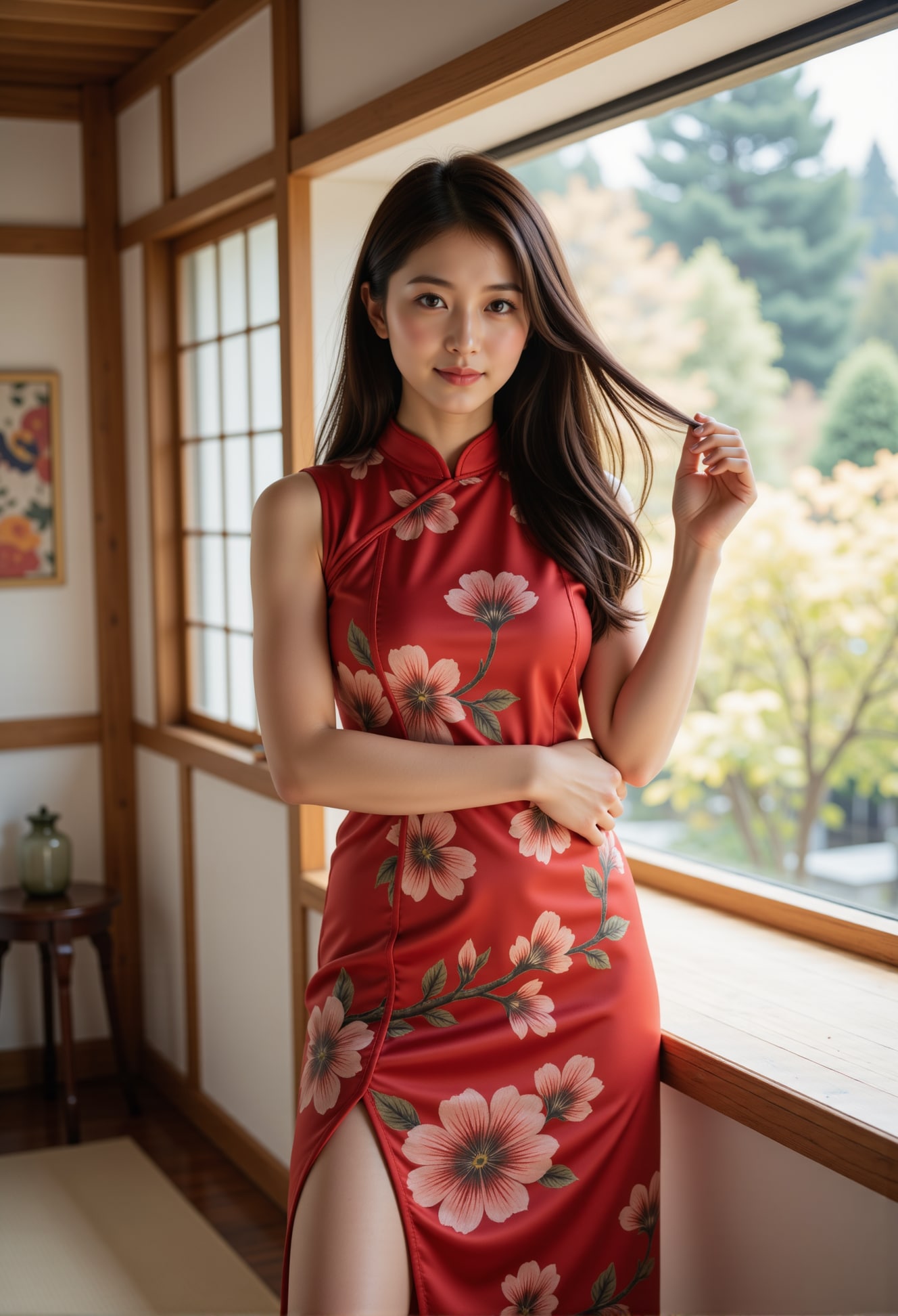 Steps: 50, Sampler: Euler, Schedule type: Simple, CFG scale: 1, Distilled CFG Scale: 3.5, Seed: 1906336433, Size: 832x1216, Model hash: 3f97fdc57a, Model: flux1-dev, Denoising strength: 0.4, ADetailer model: mediapipe_face_full, ADetailer confidence: 0.8, ADetailer dilate erode: 4, ADetailer mask blur: 4, ADetailer denoising strength: 0.3, ADetailer inpaint only masked: True, ADetailer inpaint padding: 32, ADetailer version: 24.11.1, Hires upscale: 1.6, Hires steps: 20, Hires upscaler: 4x-UltraSharp, Lora hashes: "kurumi_flux_lora_v1: 670f7ce330c0, anzu-flux-LoRA_v22: c03d2800cd05, Ashley: e675ff70810f, JasmineFluxV1: 1b4226e04b46, anego_tomomi: cc4ba8854f84, anego_ameri: bcf5ed0bde57, japanese_woman: 54f18680e104, FluxDFaeTasticDetails: 5be8e41a3a18, windP_flux: e3b0c44298fc, Be_luminous_flux_lora: 15be3c374113, Digicam: 970be74b7fdf, cheongsam_f1_rank4_bf16: 0f6e760e84fb, KW_test: b5ae8d794b07", Version: f2.0.1v1.10.1-previous-528-ge55cde9b, Diffusion in Low Bits: Automatic (fp16 LoRA), Module 1: clip_l, Module 2: t5xxl_fp16, Module 3: ae