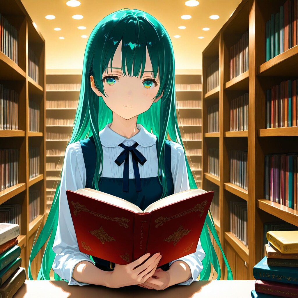 ◆メイドカフェ店員(緑髪、ロングヘア、緑色の目、25歳、料理が得意でカフェの料理担当、胸が平らの痩せすぎなアニメキャラ)が、カフェの新メニューを参考にする書籍を探しに「本屋さん」にいます。