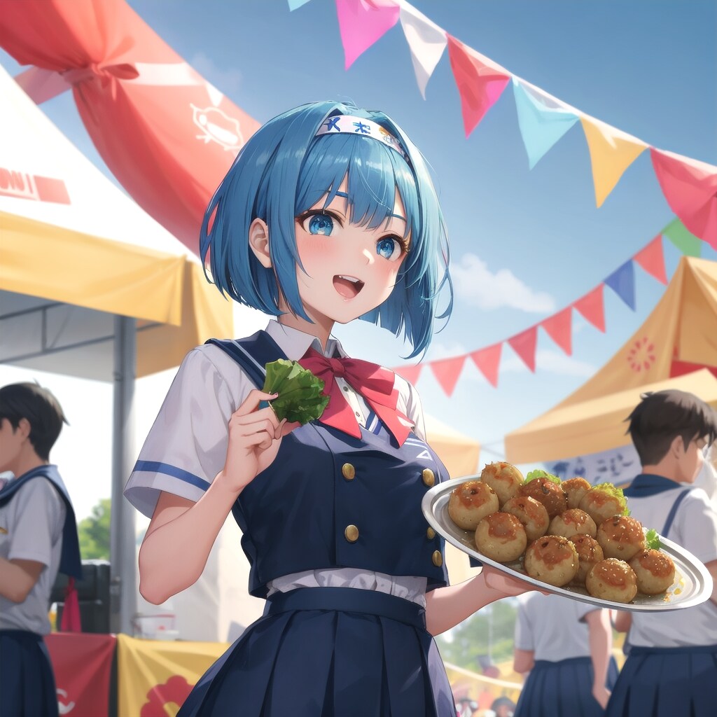 文化祭の屋台で、青髪ボブ子ちゃんがたこ焼きを食べています。祭り仕様の制服にカチューシャをつけ、熱々のたこ焼きをフーフーと冷ましてから口に運んでいます。周囲には色とりどりの屋台や楽しそうな生徒たちの姿があり、活気のある雰囲気です。