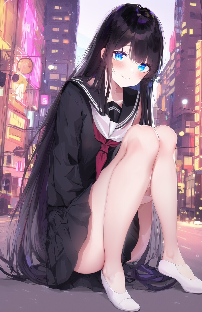 妖しいネオン街で座っている黒セーラーの黒髪ロングちゃん