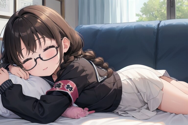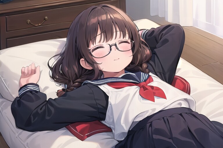 XでYo○iboとアド○イヤジャ○ンの話題を見てちょっと間を置こうと思ってた委員長ちゃんの寝顔の件を頑張ってみました。1枚目は久々のちちぷい生成高解像度バージョンの画像ですが良い感じでしたのでメインに持ってきました。2枚目も良かったんですけども。他の方のプロンプトも読んでみてその中から色々と参考にさせていただきました。他にも無表情っぽくしたりだらしない感じにしたり色々な方向性がありそうですね。