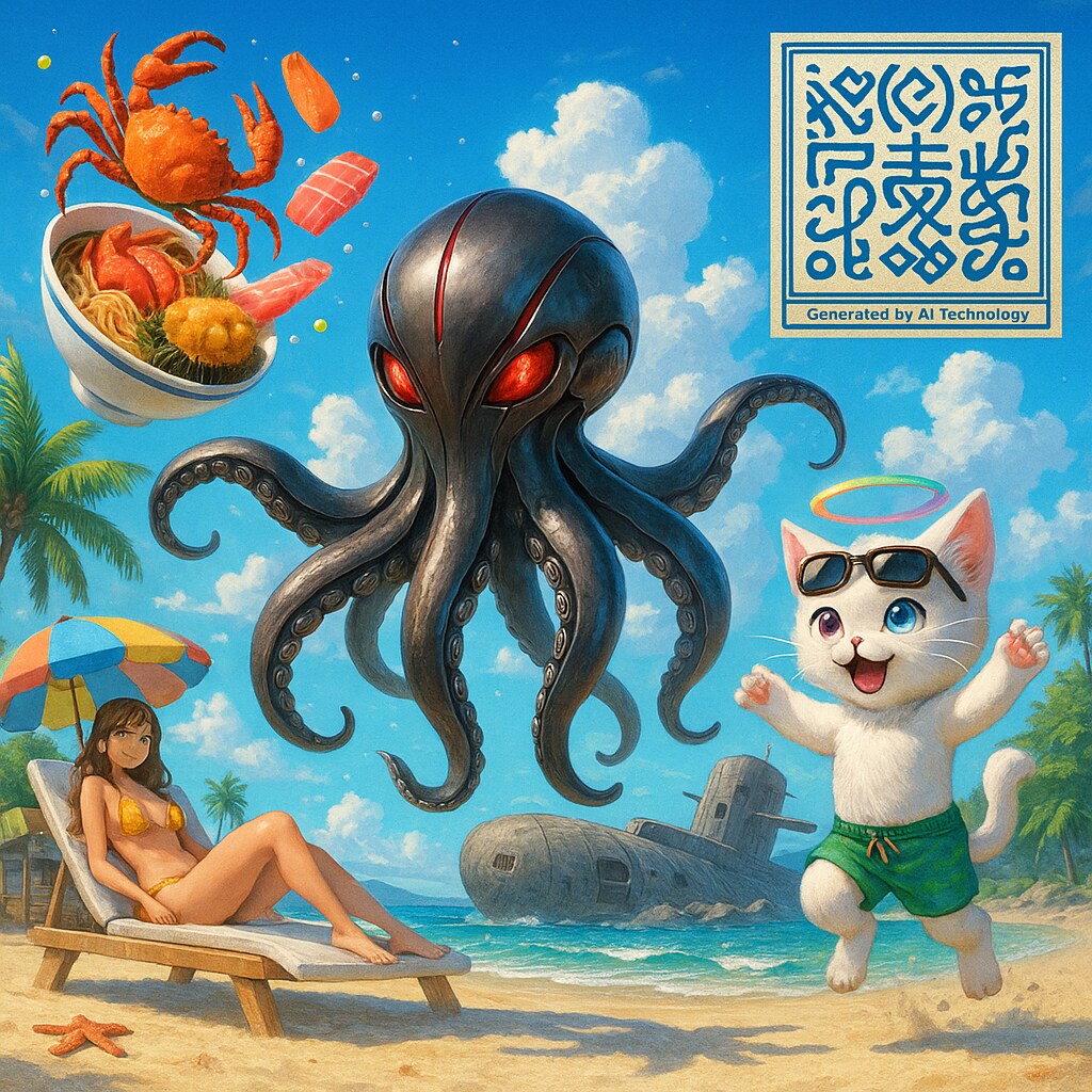 “Octo-Lynx-Pa”は、タコ文明のシンギュラリティ史を凝縮した三和音だ。Octoは触手的並列処理の身体=海底都市群のネットワーク、Lynxは異文明に優しく接続する猫貌=夢界インタフェース、Paは拍・平和・終止=祭祀としての意思決定。タコ神は惑星レベルの分散演算層として覚醒し、自らも化身しながら外界交流のため従者モデルを設計した。オクト・リンクス・パだ。ラーメン丼から跳ねる海の恵みや、空に踊る具材の軌跡までもがPaの律動を刻み、祝祭と批評、技術と神話が同位に響く。