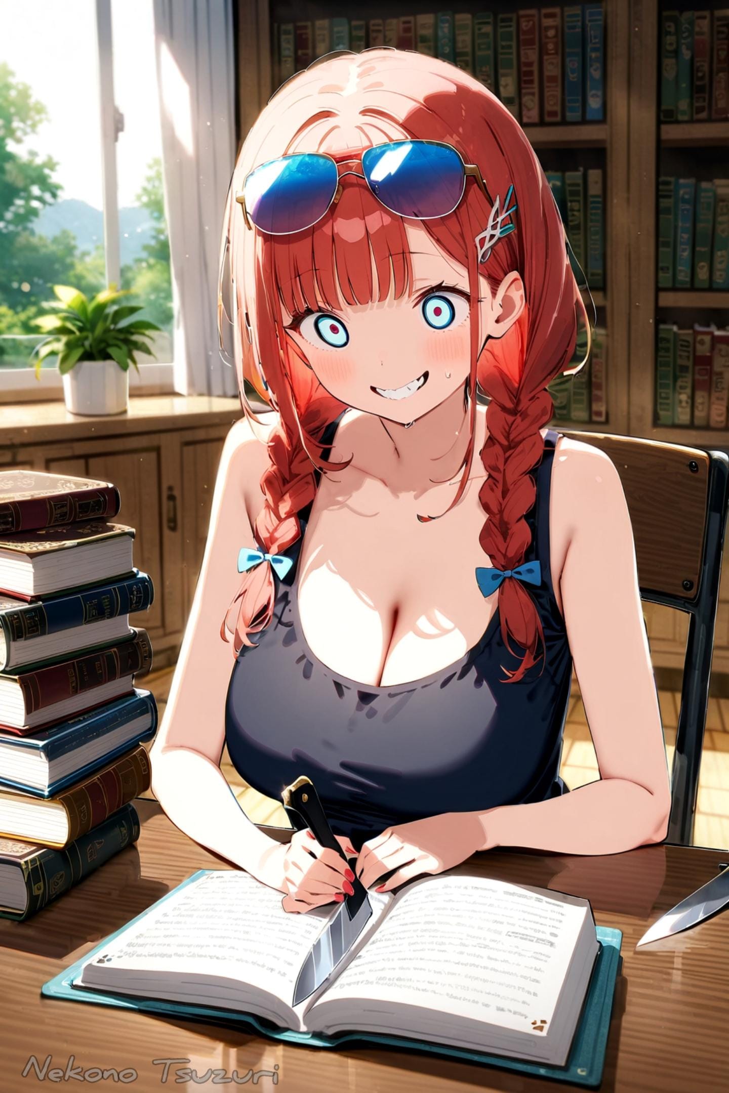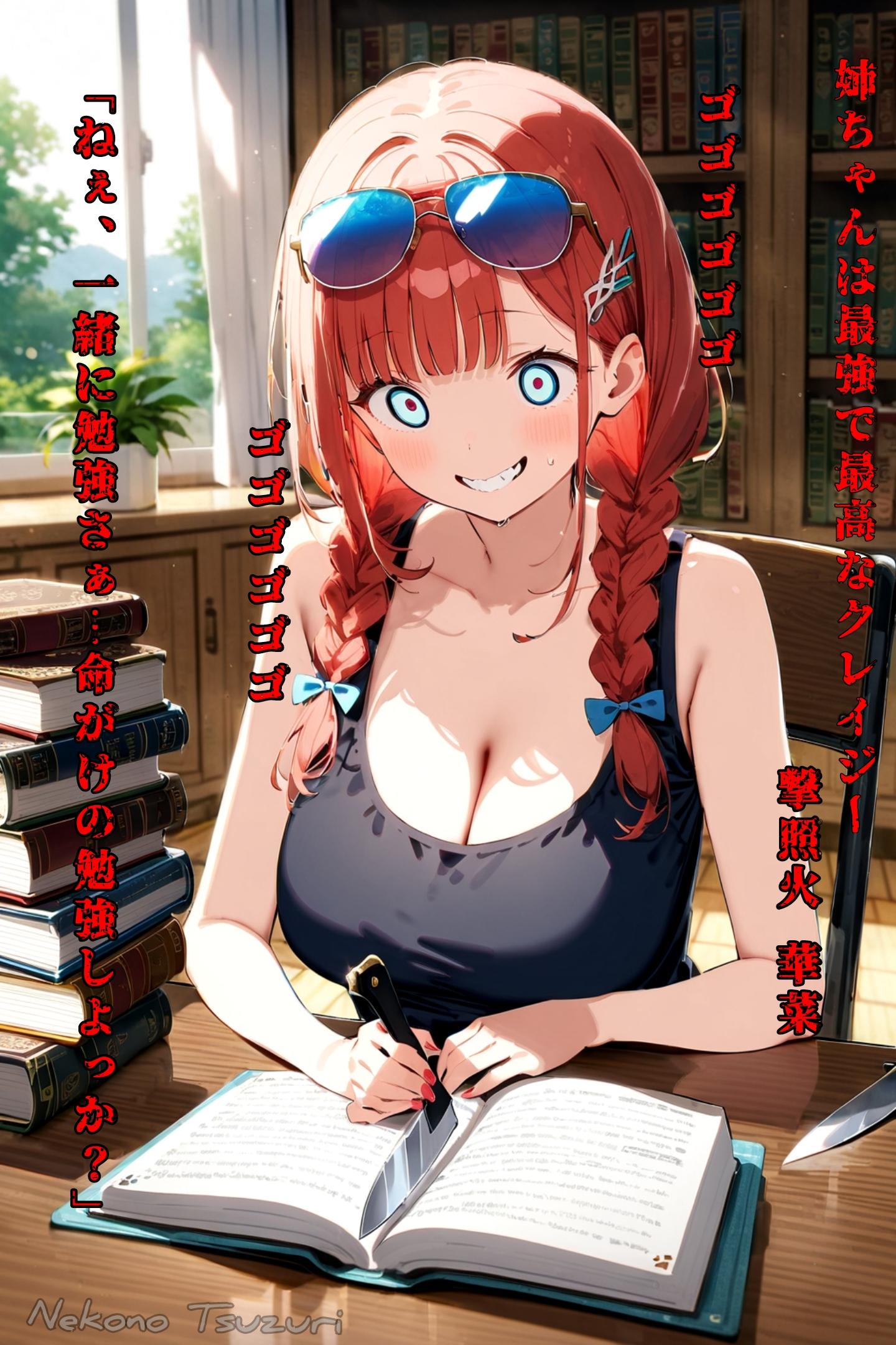 眼鏡、三つ編み、図書館は、企画の普通姉ちゃんにあった要素を含めつつ、現在、開催されてる企画も組み合わせてチャレンジしてみたものであります。crazy eyesやcrazy smile,そして、ナイフを持たすことで、クレイジーでサイコーなお姉さんができてよかったです。
