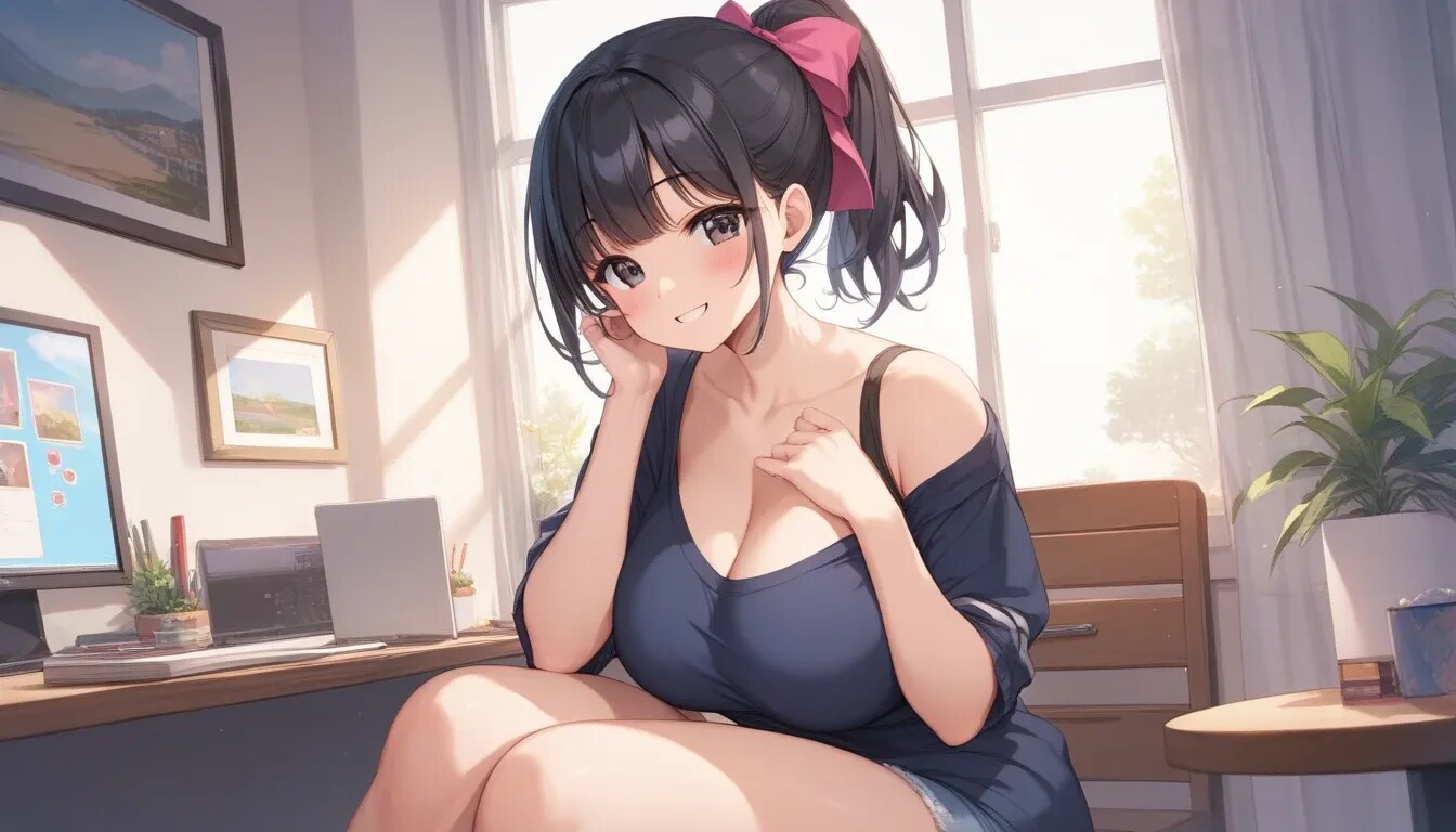 上記の彼女は当サークルとSNSのアカウント及びサイトのメインキャラクターとメインヒロインを務める黒髪ポニテと爆乳がトレードマークの『重追仁美(しげおいひとみ)』です。