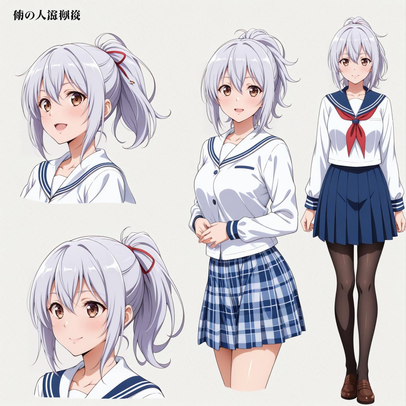 1girl,bishoujo,teen,(brown eyes:1.2),bangs,silver hair,ponytail,ponytail tied with red ribbon,medium breasts,hair between eyes