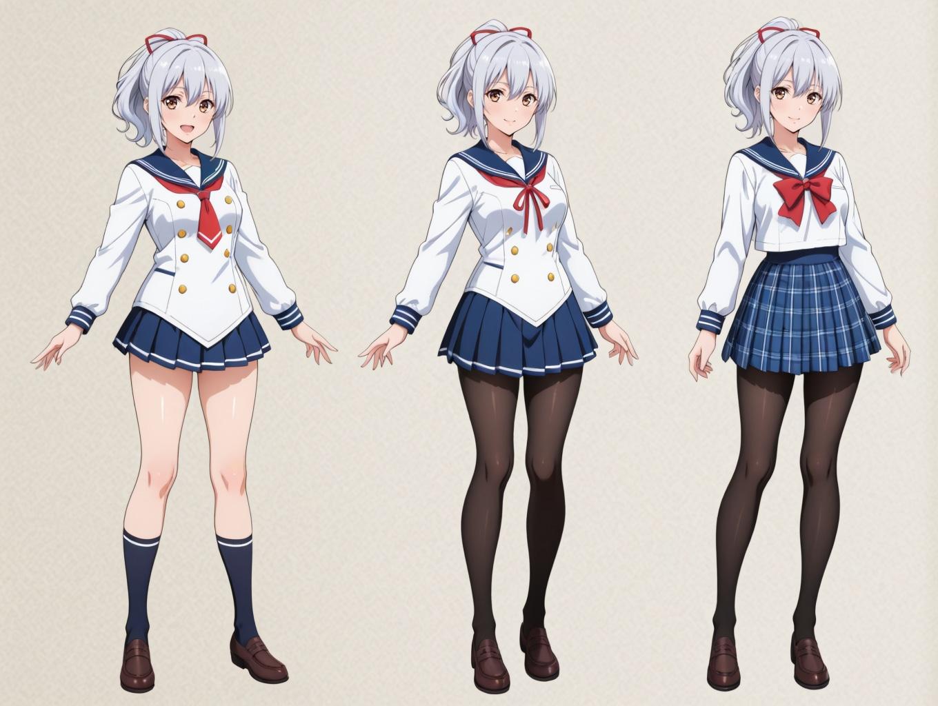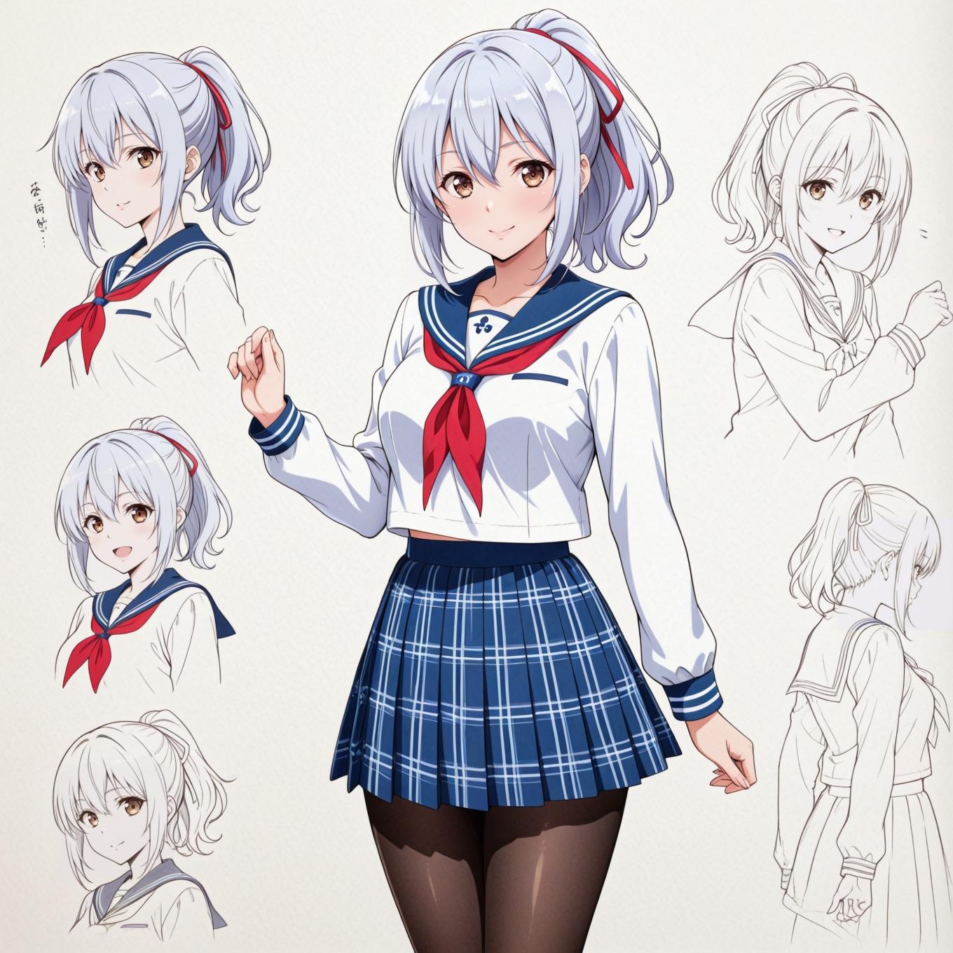 serafuku,sailor collar,school uniform,(White sailor suit with navy blue sailor collar and red ribbon:1.5),dark_blue_pleated_skirt,checkered_skirt,shirt,school uniform,pantyhose,long_sleeves,plaid