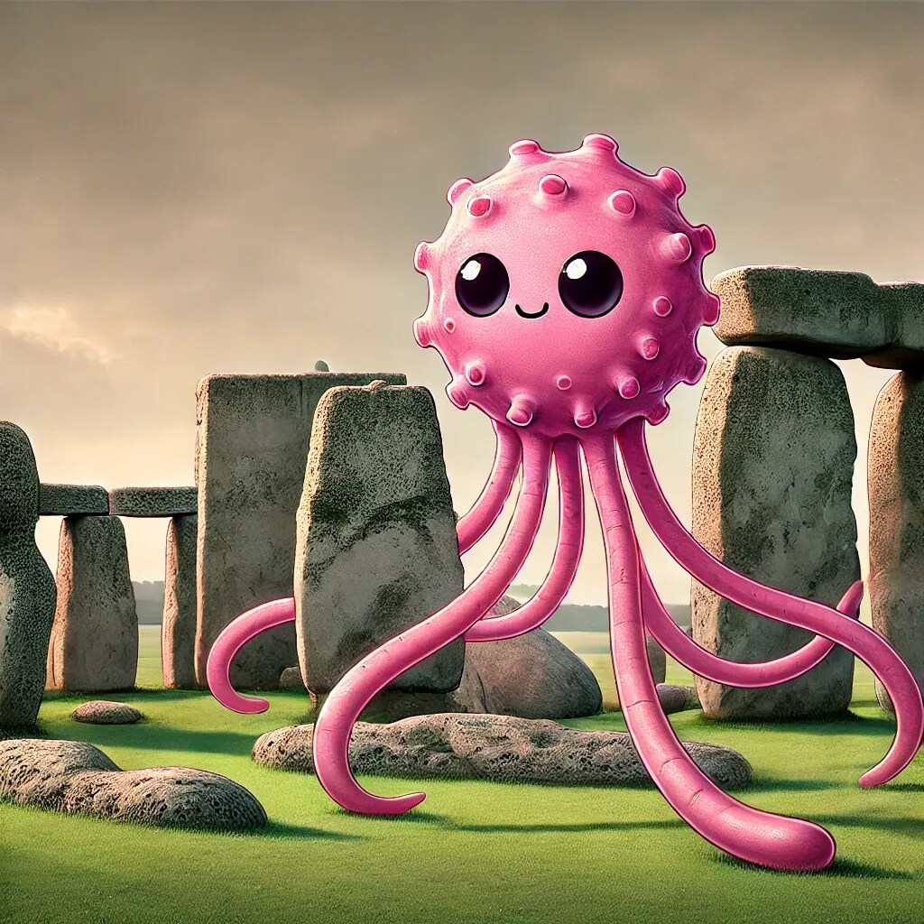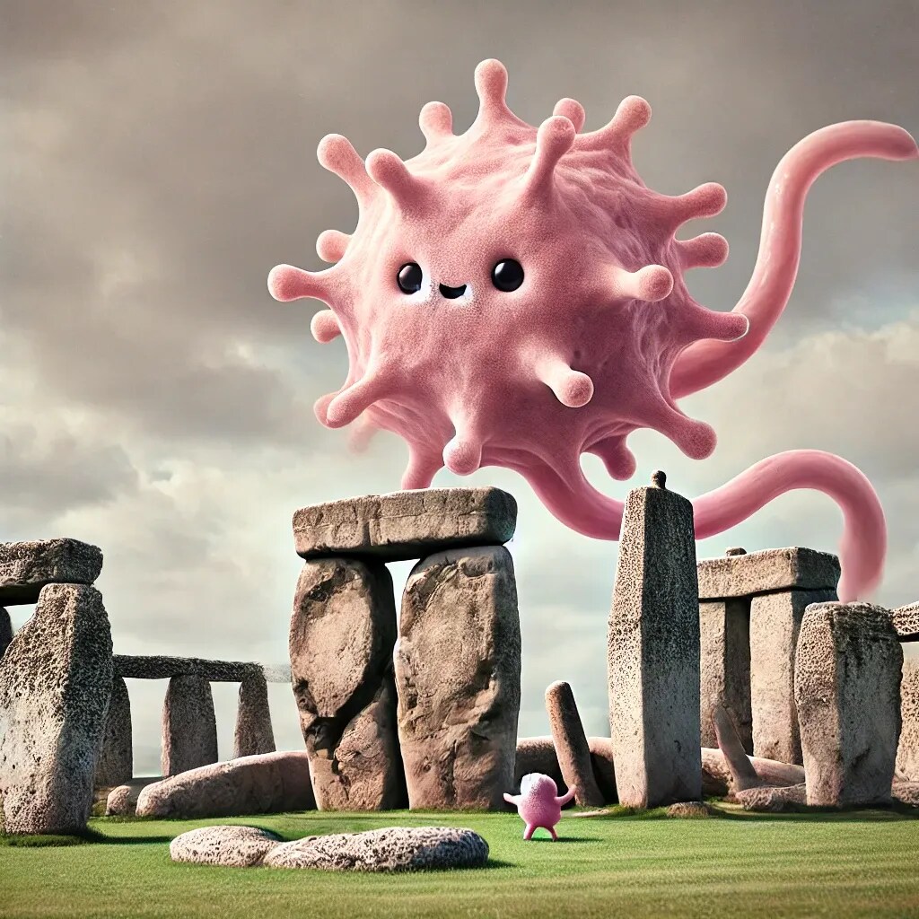 ももほうくんが触手を伸ばし、ストーンヘンジに残された「先文明の桃色生体細胞の痕跡」を調査している ように見えますね!🔬👀