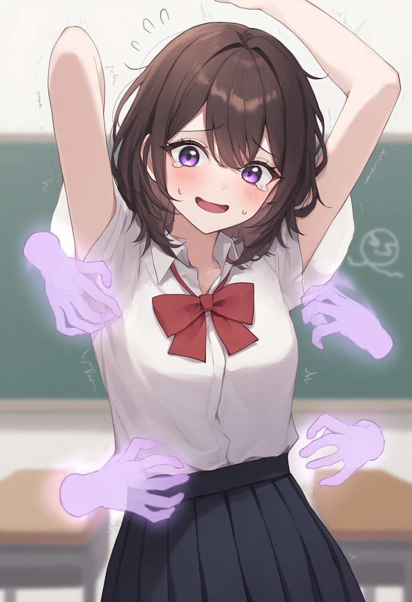 girl, possessed girl, young woman, fair skin, medium-length brown hair, slightly messy hair, wide purple eyes with a flustered expression, slightly open mouth as if sighing, small sweat drop on forehead, light purple ghostly aura floating around her, faint cartoonish spirit hovering beside her making a silly face, wearing a school uniform with a slightly loose ribbon, arms up, laugh with tears