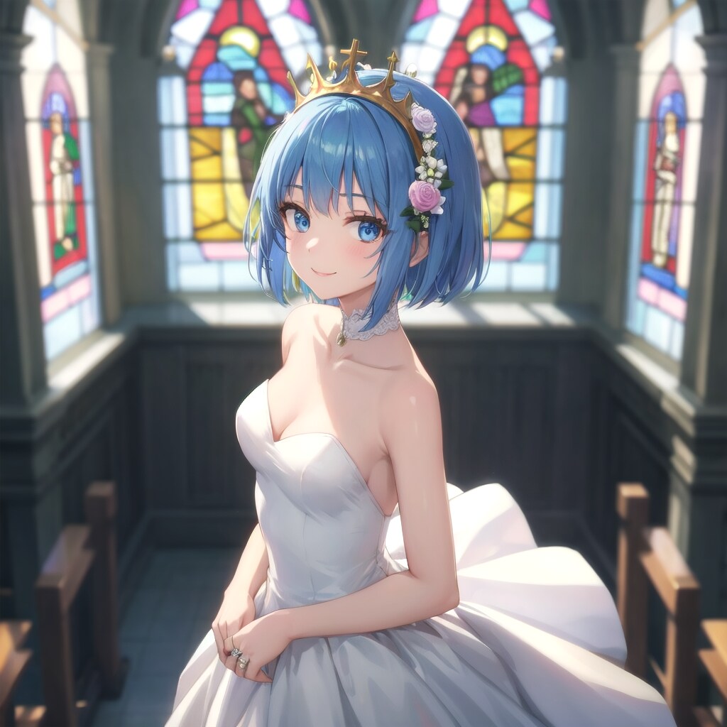 青髪ボブ子ちゃんに「プリンセスライン」のウェディングドレスを着てもらいました。