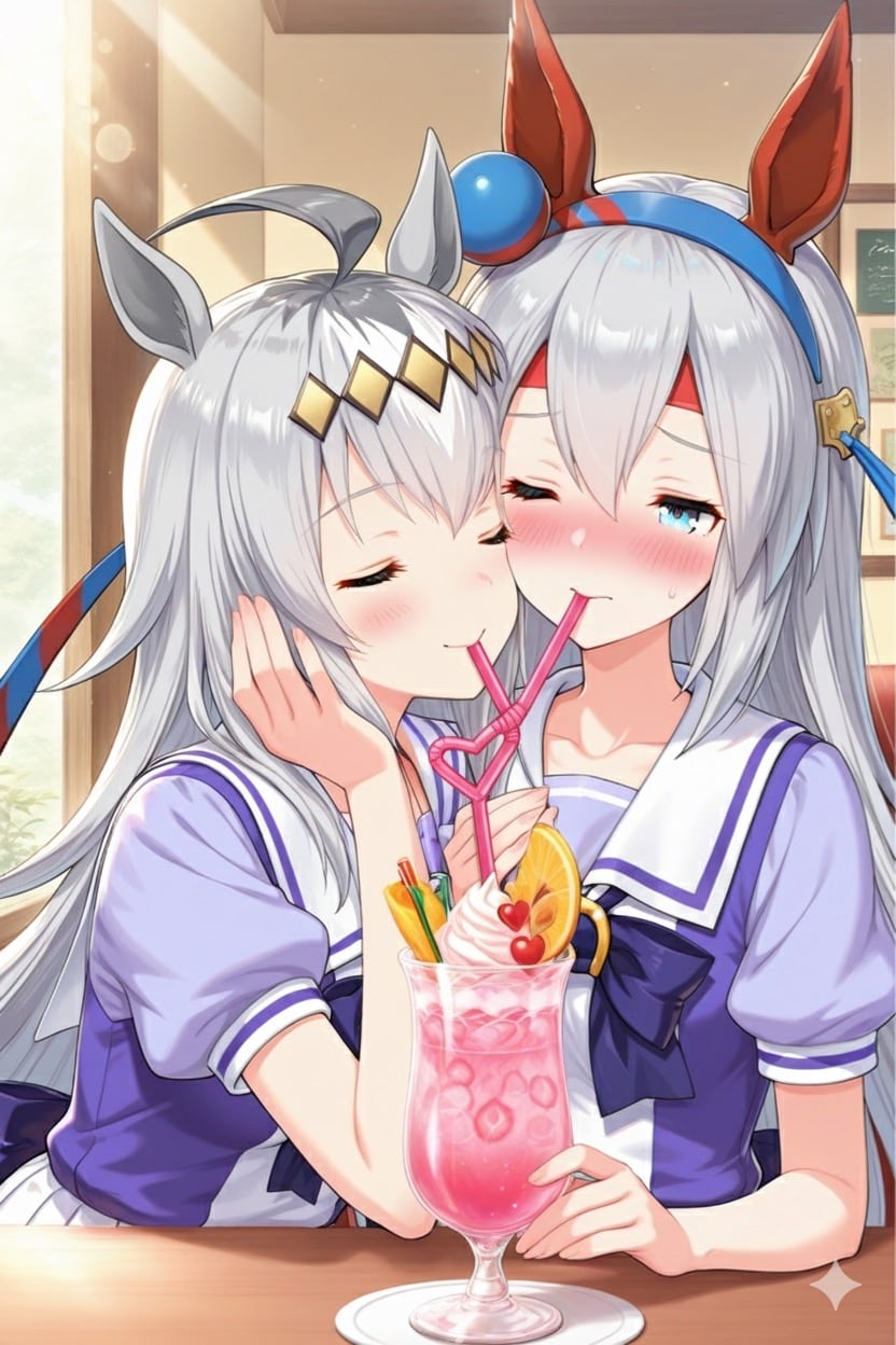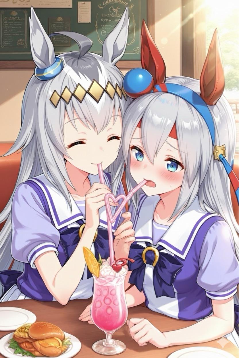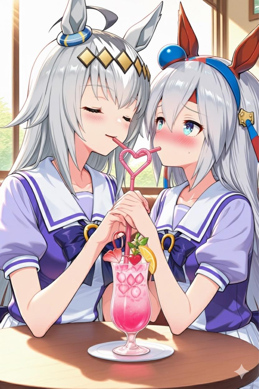 喫茶店でカップルドリンクを飲むオグリキャップとタマモクロス。