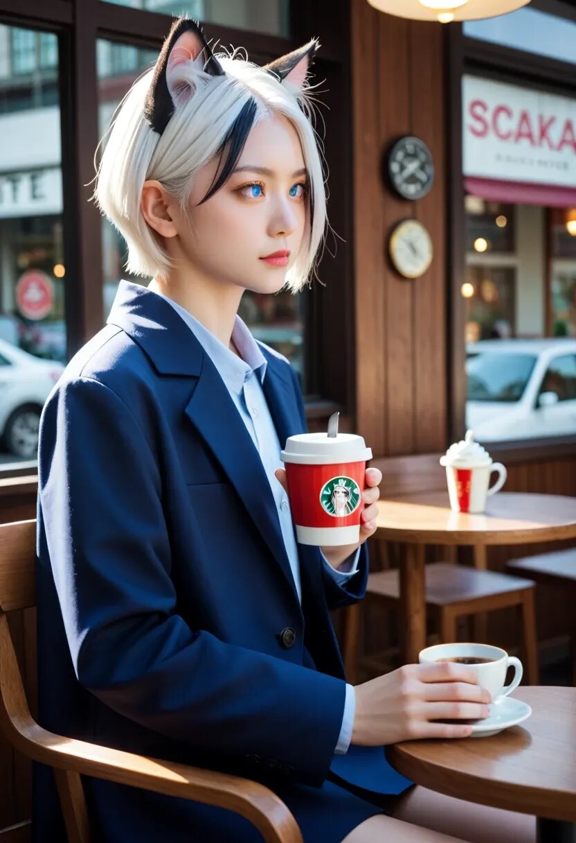 コスプレの姿でコーヒーを飲むシズク、