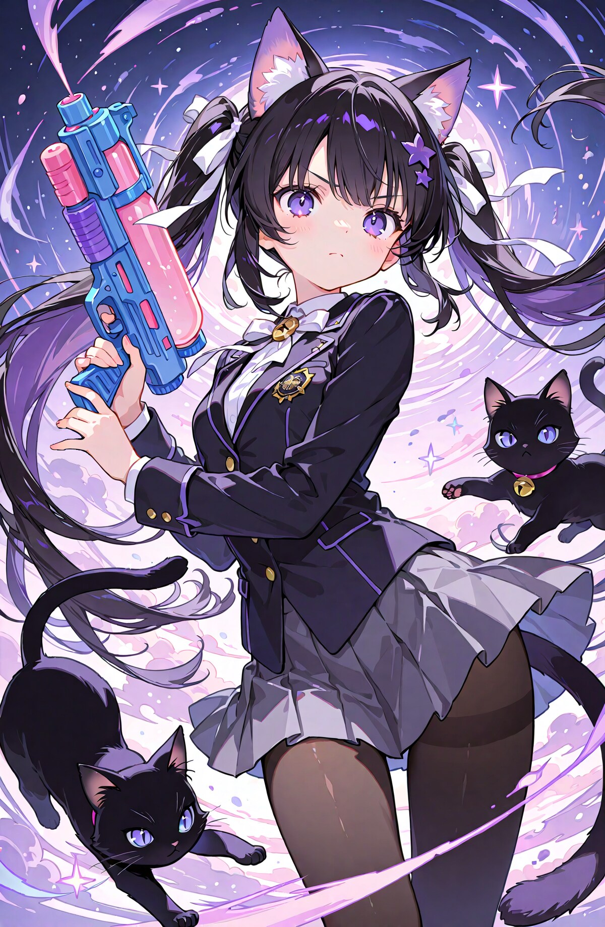 ということで当方の作品世界の黒髪ツインテキャラ代表、カペラさんで二挺ウォーターガンでキリっとしてもらいました。全12枚あります。