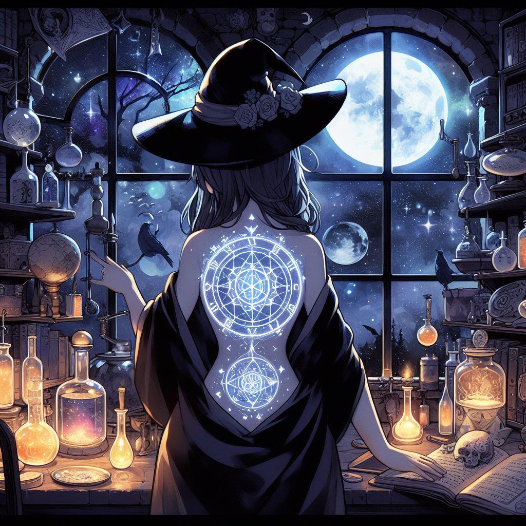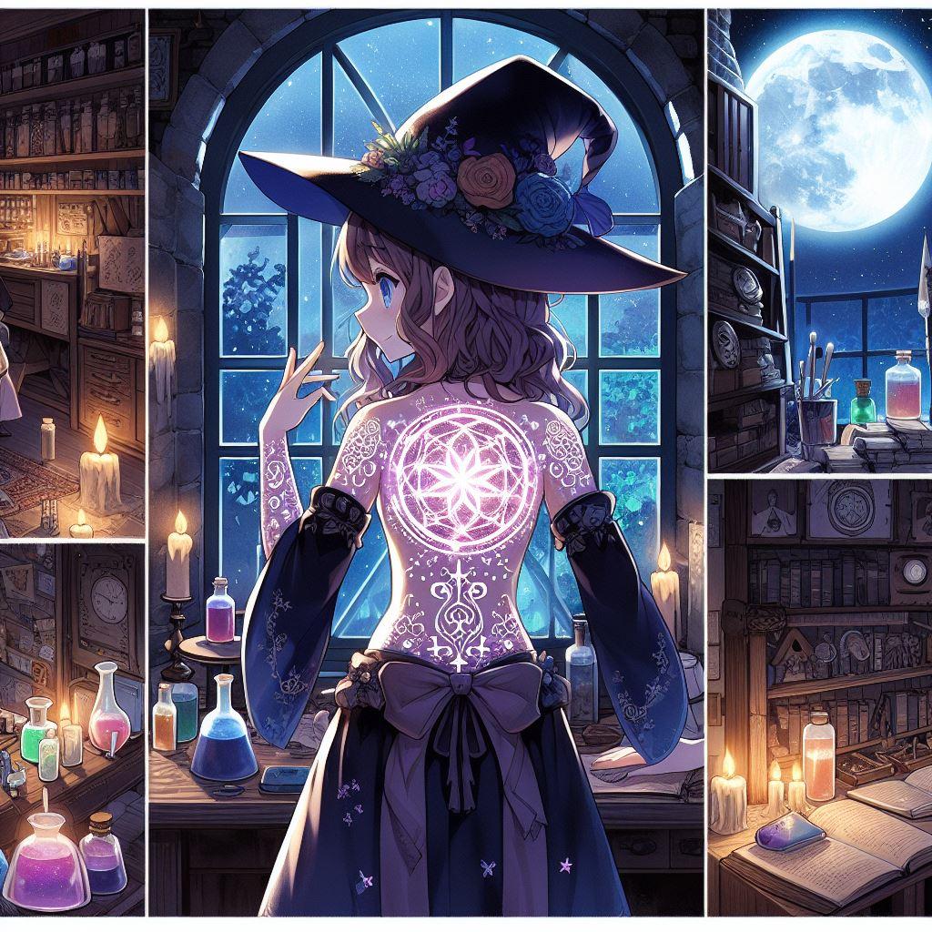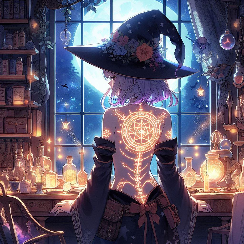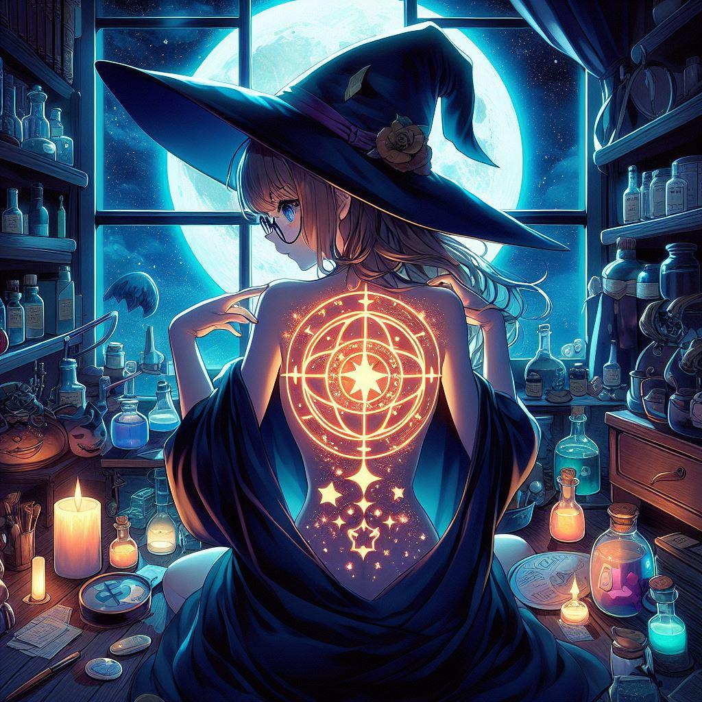 魔女になるための最後の仕上げとして、魔力を込めた指先で彼女自身に魔法陣を刻んでゆく。