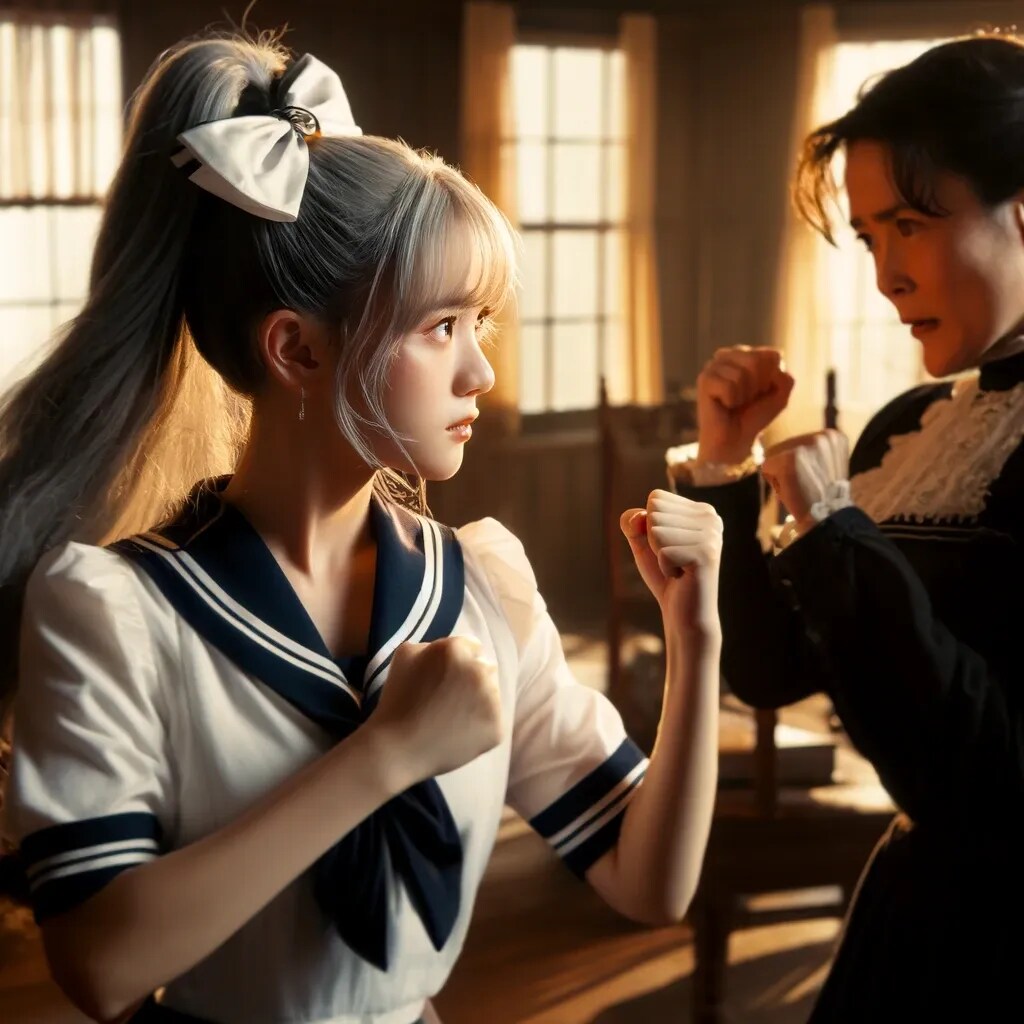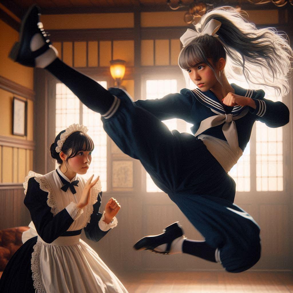 余裕を見せる祖母の隙をついてハイキックを繰り出す母