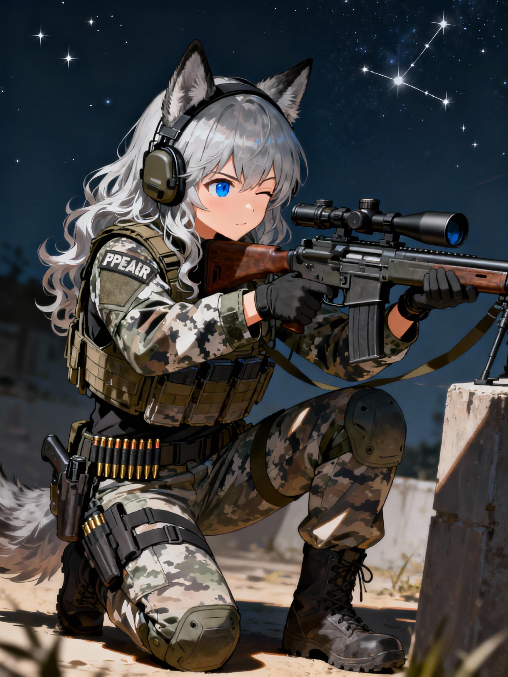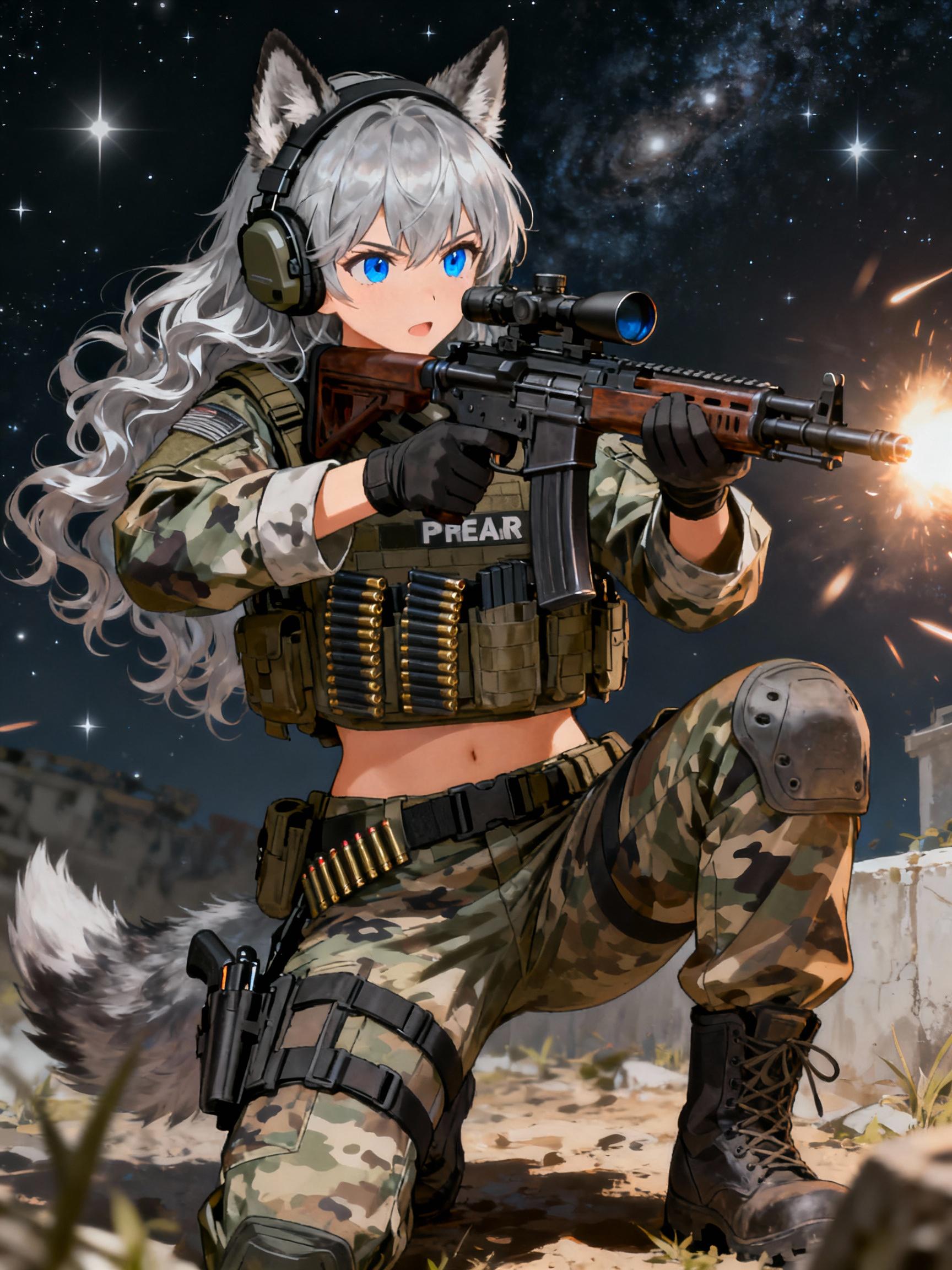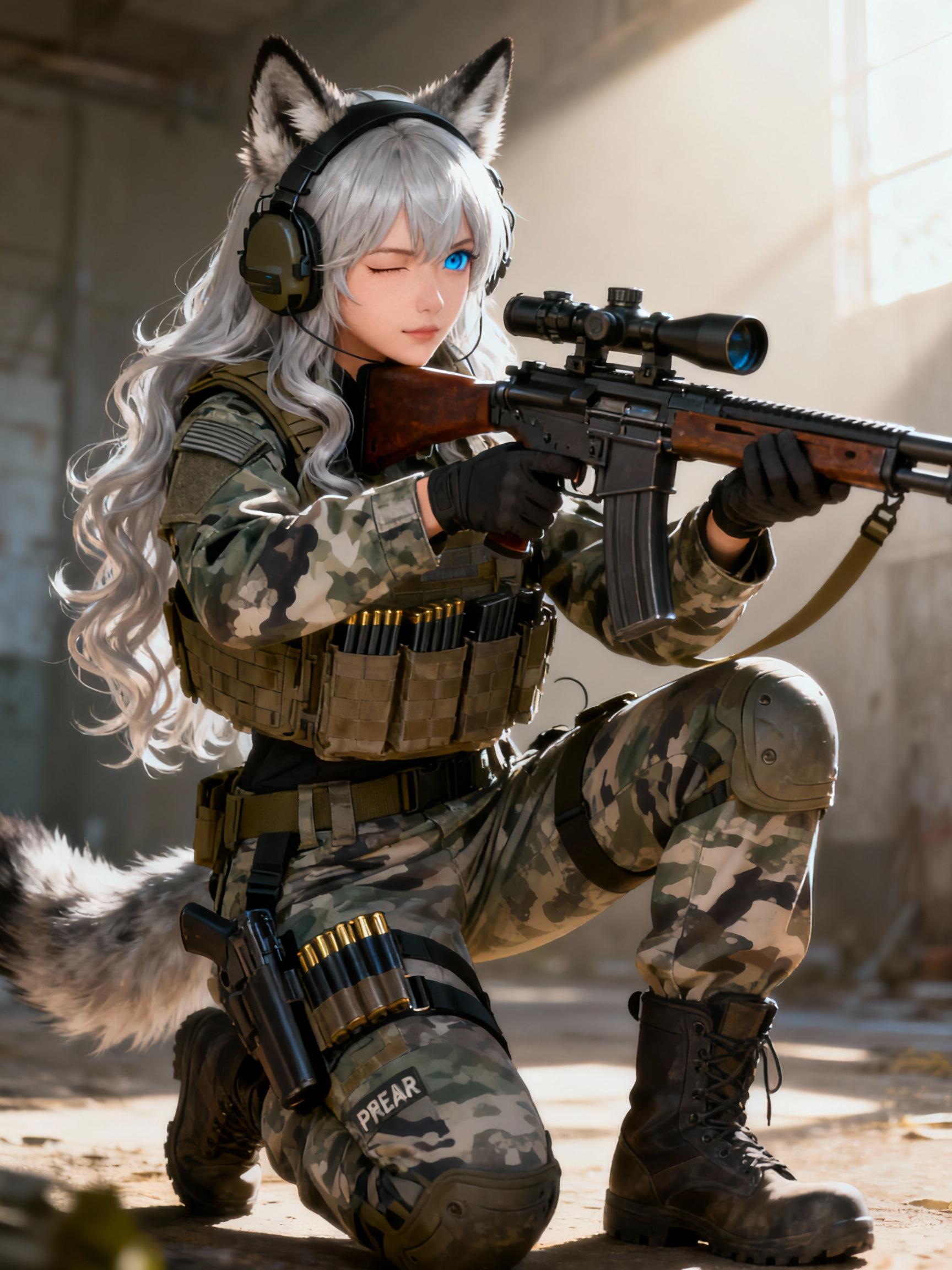 射撃陣地からM14ライフルを撃つカモフラウルフちゃん🐺
