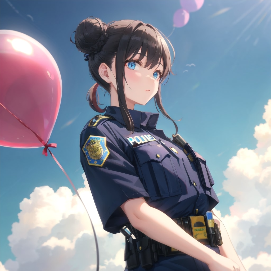 赤い風船を持つ黒髪お団子ヘアの警察官の美女。