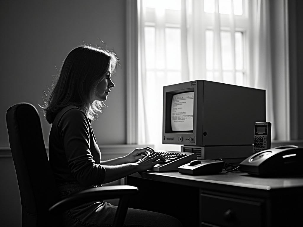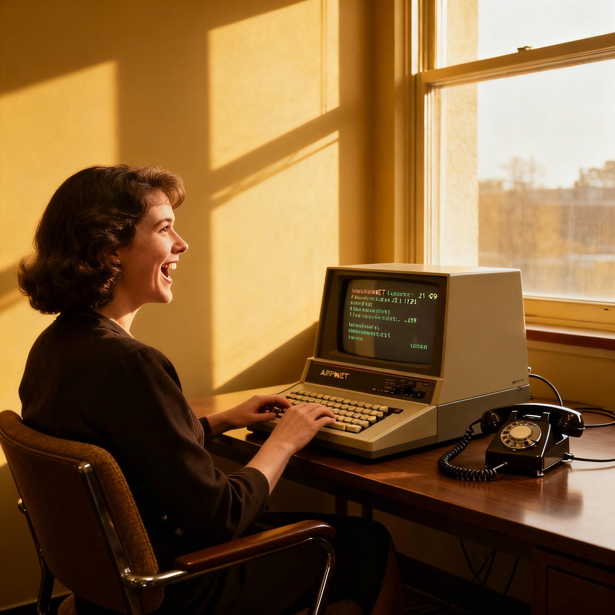 Masterpiece, Best Quality, Amazing Quality, Very Aesthetic, High Resolution, Ultra-Detailed, Absurdres, Newest, Scenery, 3D, Rendered, General, 1Girl, Mature_Female, Aged_Up, Single_Braid_Hair, Blunt_Bangs, Black_Brown_Hair, Flat_Chest, Indoors, Computer_Room, CRT_Display, Landline_Phone, Day, November 21, 1969. ARPANET officially launched in the United States. Connecting four universities via network, the first communication demonstration experiment using microcomputers began here. She sat in a chair facing the microcomputer and CRT display on the table, typing her very first communication message. Next to the computer, a telephone receiver rested on a coupler. She couldn't hide her face, filled with excitement or perhaps curiosity at this unprecedented experience. Light streaming through the window gently enveloped the space, brightly illuminating the future., Indoors, Computer_Room, Day, Cinematic_Lighting, BREAK, Depth_of_Field, Volumetric_Lighting,